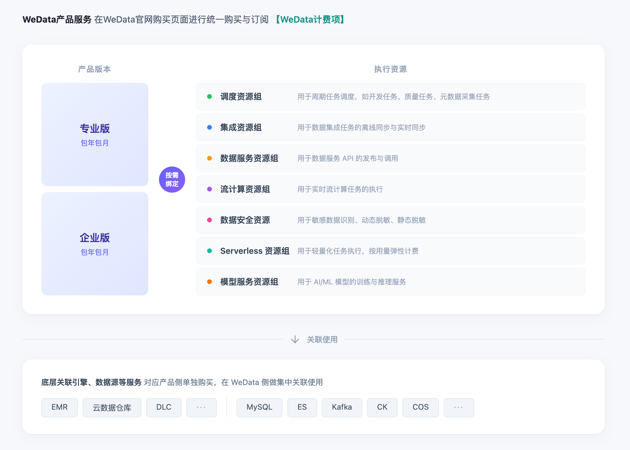 在 WeData 功能内需要使用的 EMR、DLC、云数据仓库 TCHouse-P、云数据库 MySQL、COS 等大数据引擎与数据源服务等均不包含在 WeData 计费项。这类产品请参考对应产品计费逻辑,在其产品官网购买后,即可关联至 WeData 使用。