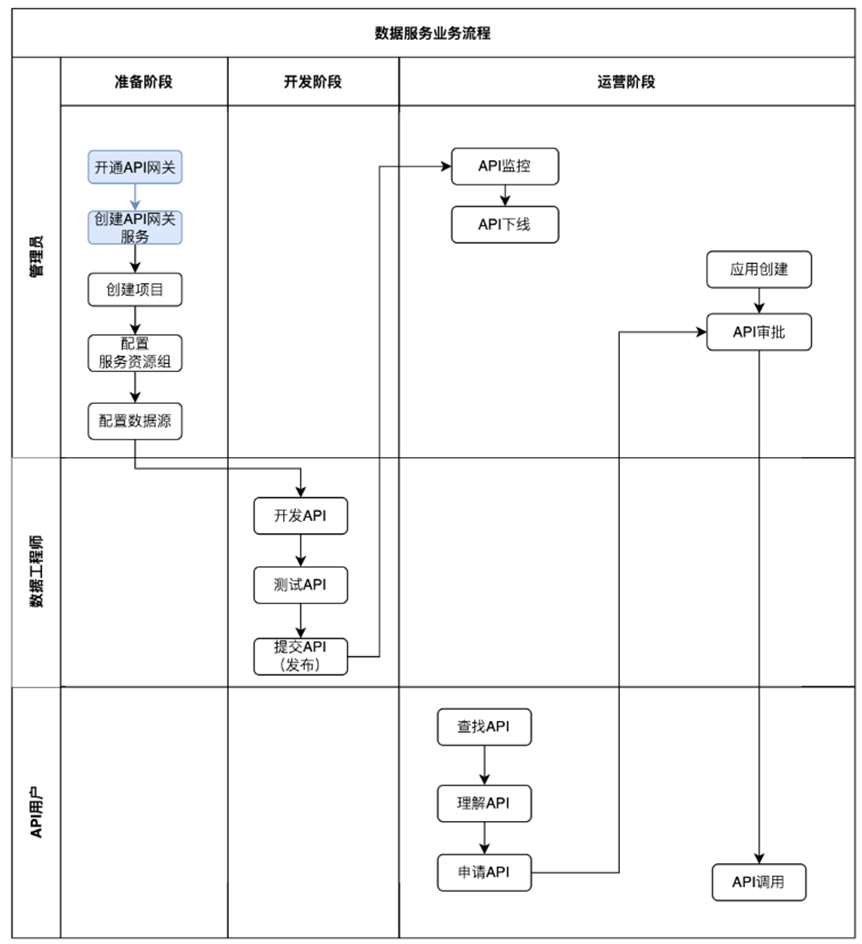 数据服务功能的使用可分配三个阶段,分别是准备阶段、开发阶段和运营阶段,如下: