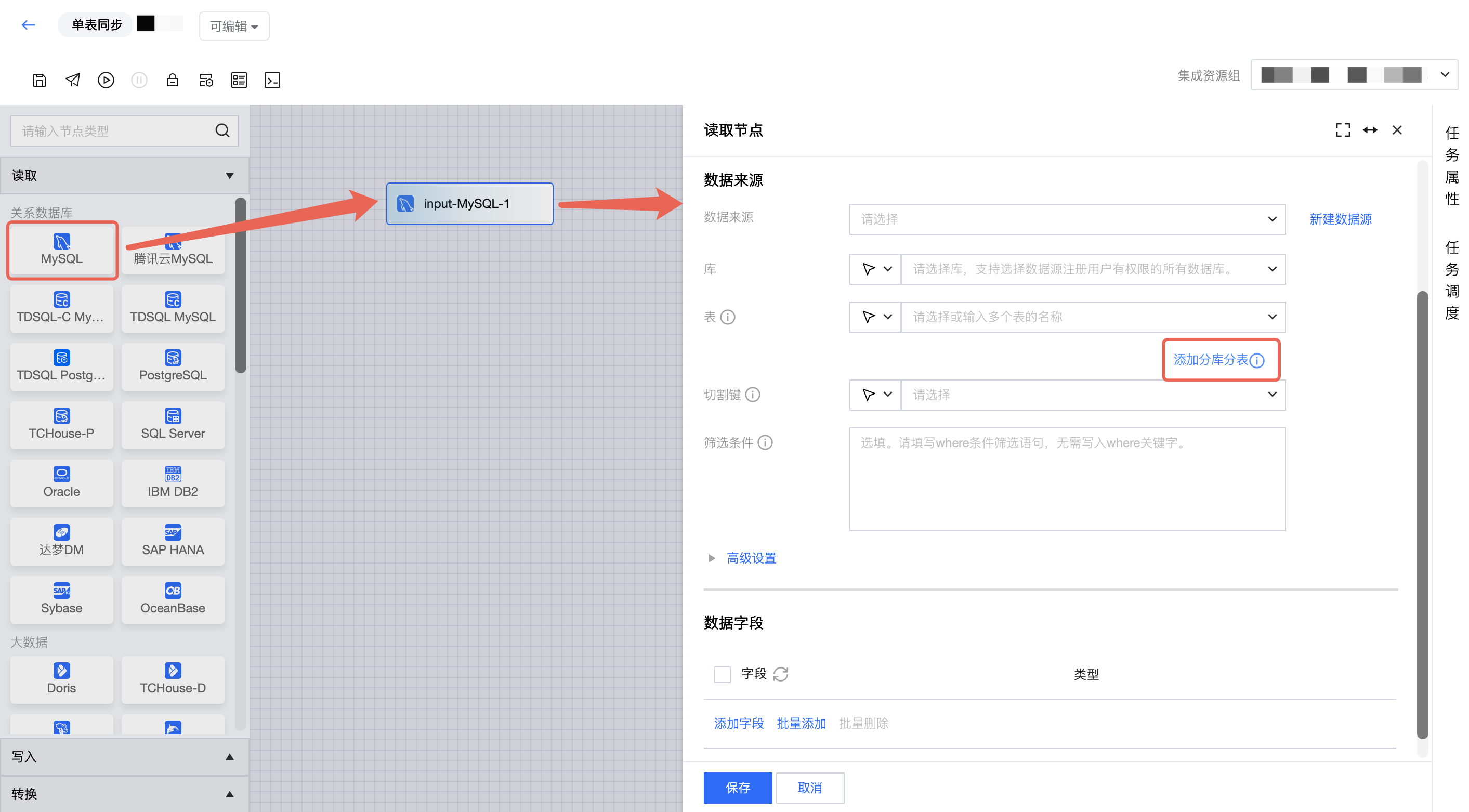 2. 拖拽 MySQL 读取节点,默认 MySQL 读取节点支持一个数据源,单个数据源(库)内可选择多张 MySQL 表。若存在分库情况,可单击添加分库分表,即可创建多个数据源并添加对应的表对象。