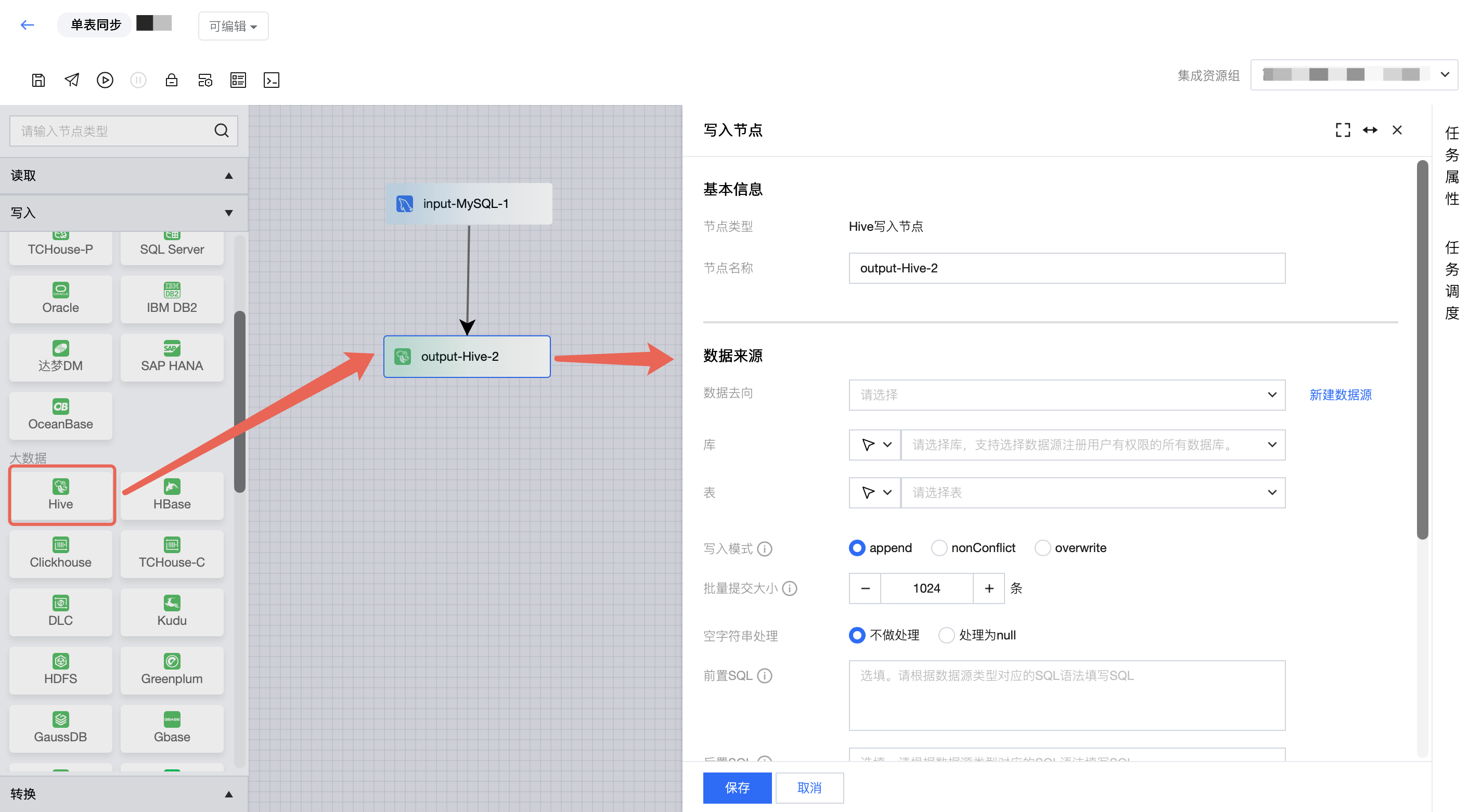 3. 拖拽 Hive 写入节点,并配置读写字段映射。