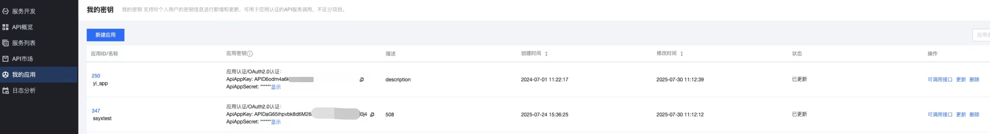 应用列表中展示已创建的应用信息,包括应用 ID、应用密钥、描述、创建时间、修改时间,提供查看可调用的 API 接口、更新应用、删除应用的操作功能。