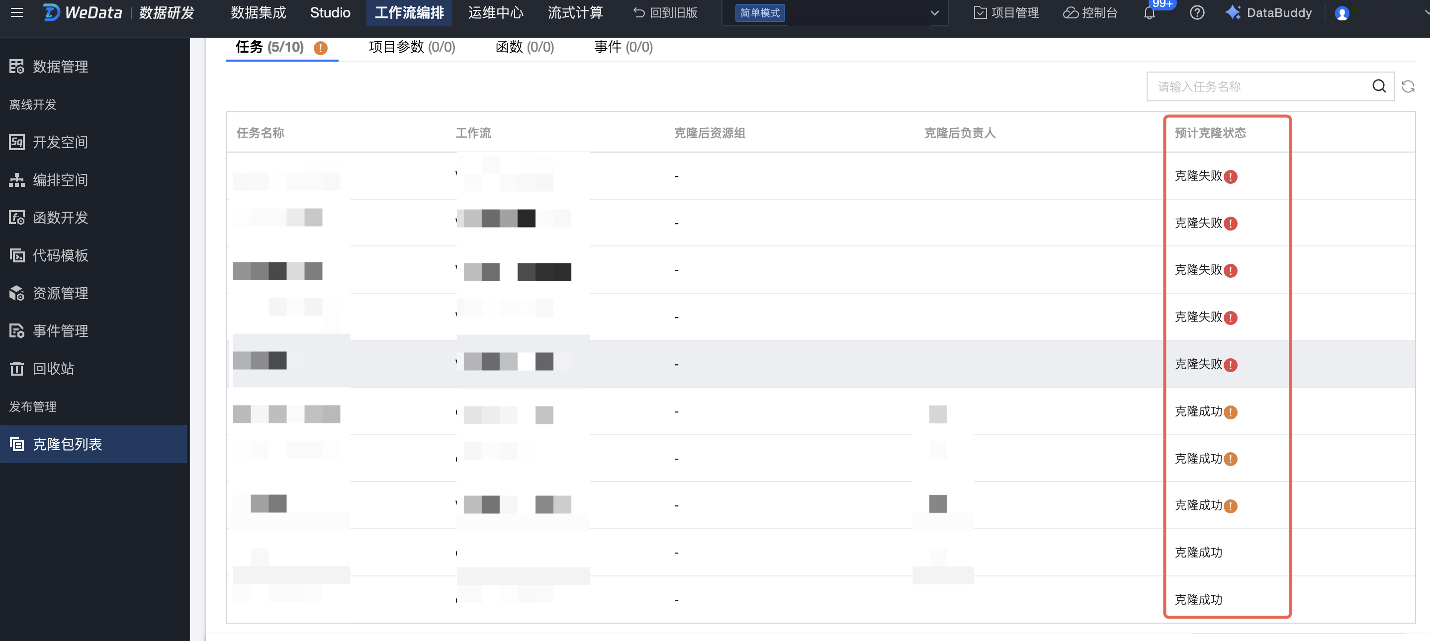 克隆结果:以表格形式分别展示工作流/任务、项目参数、函数、事件的总个数、成功/失败个数。