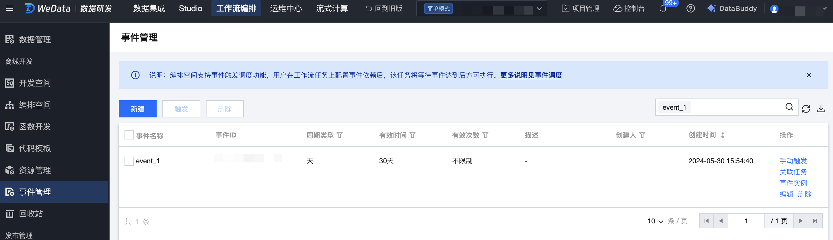 在源项目的事件管理中创建调度任务需要依赖的事件,例如这里创建了 event_1 的事件。