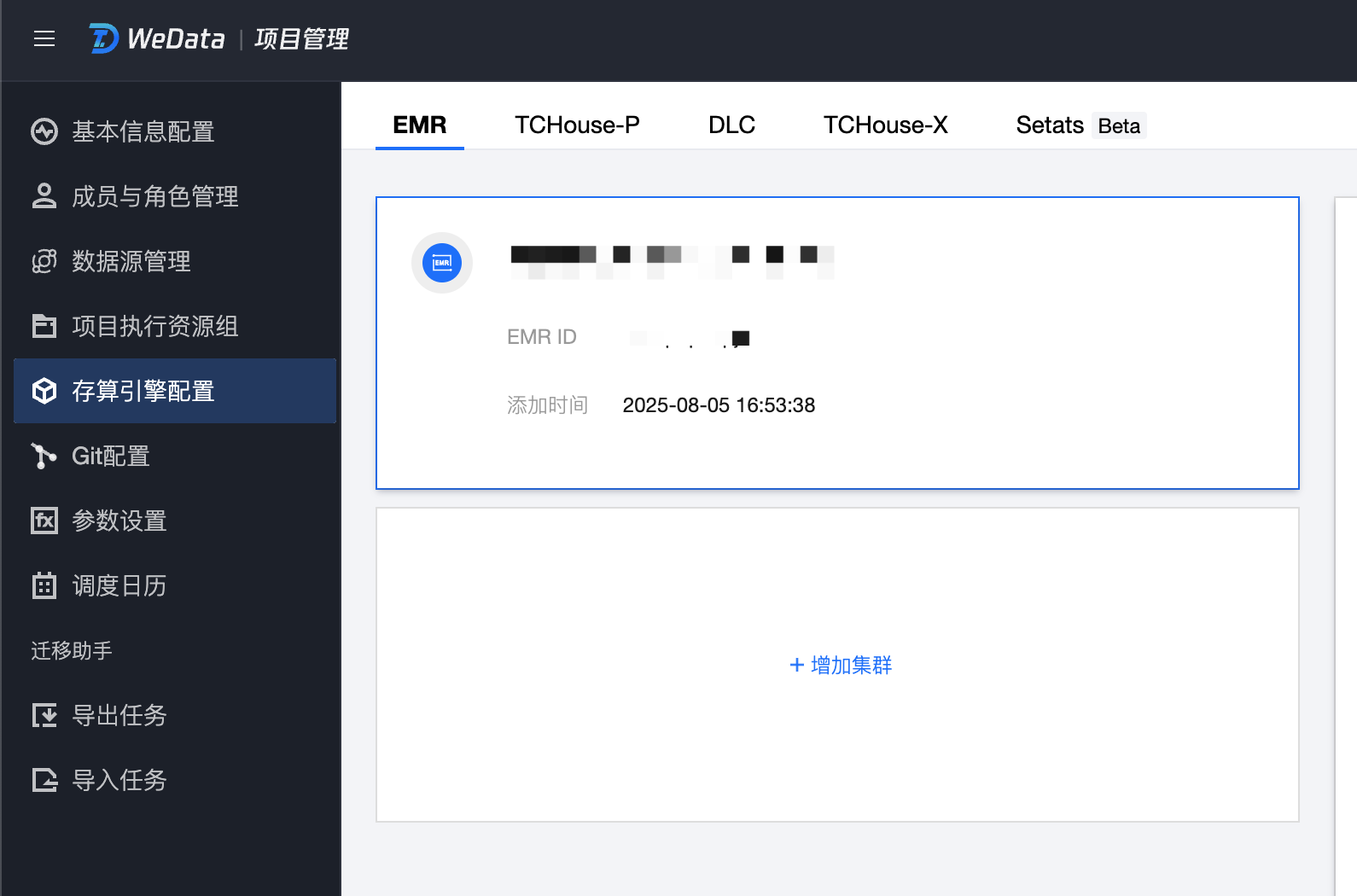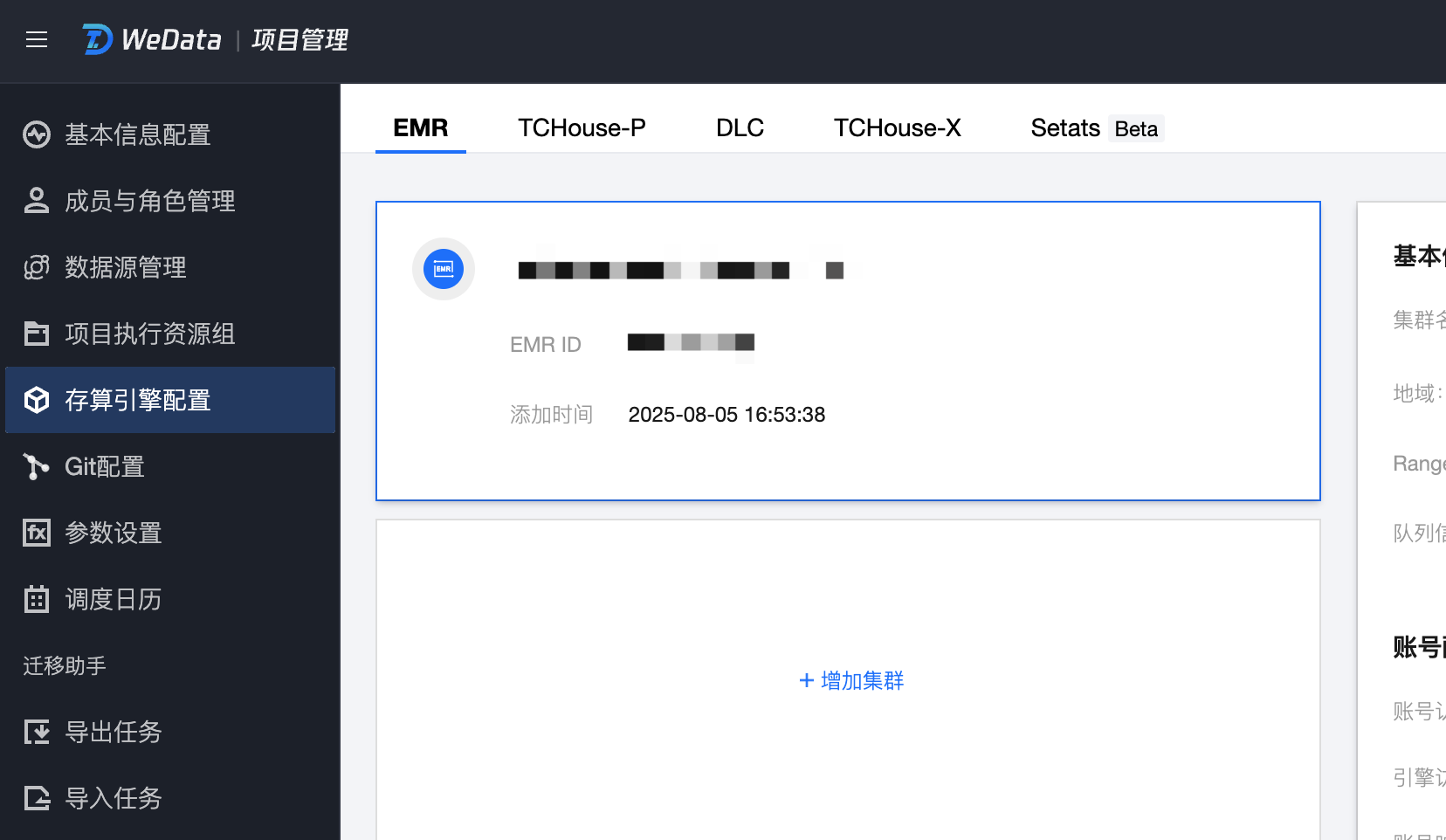 进入目标项目后单击右上角项目管理,在左侧栏配置引擎、资源组、数据源等信息。