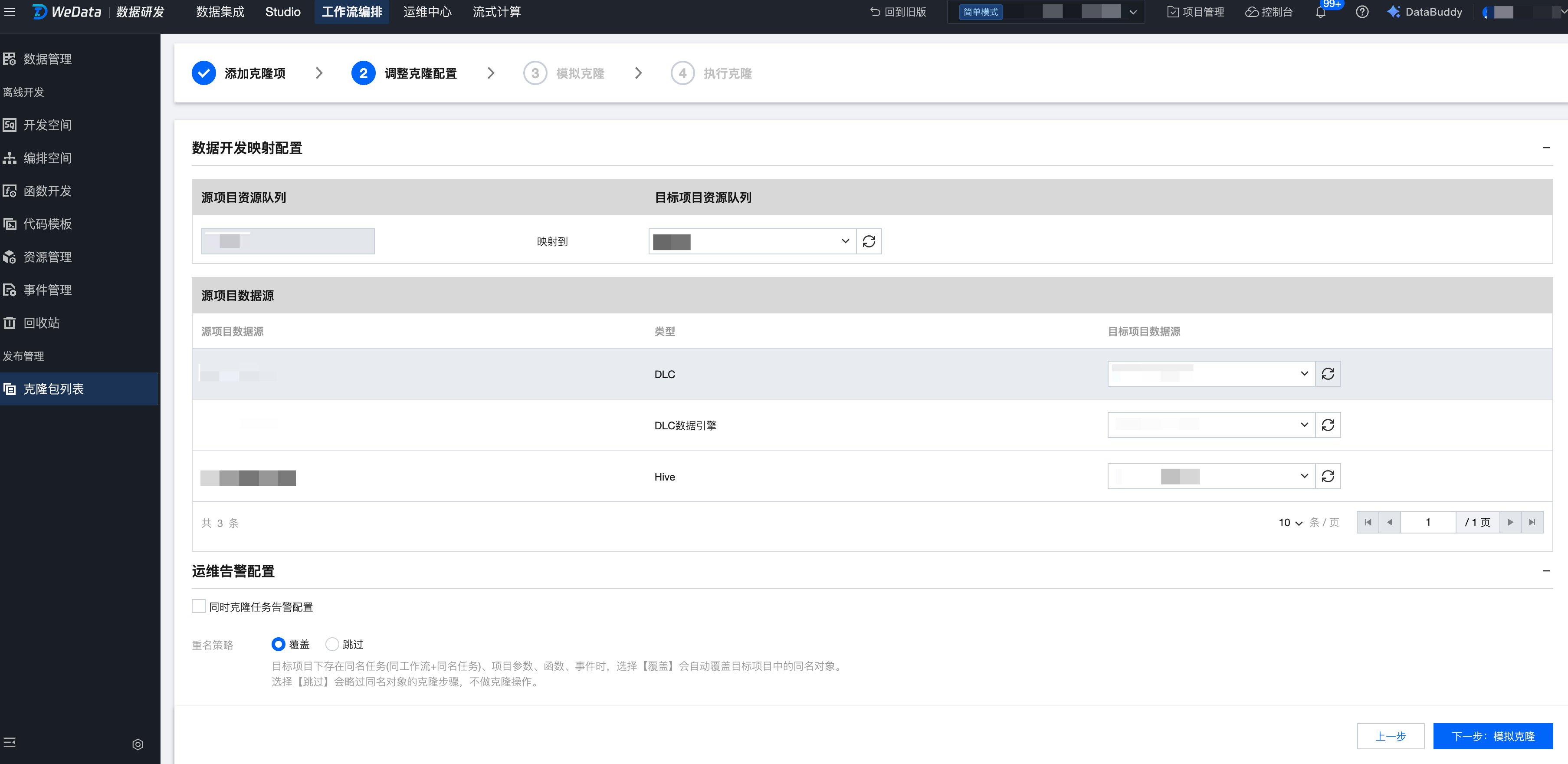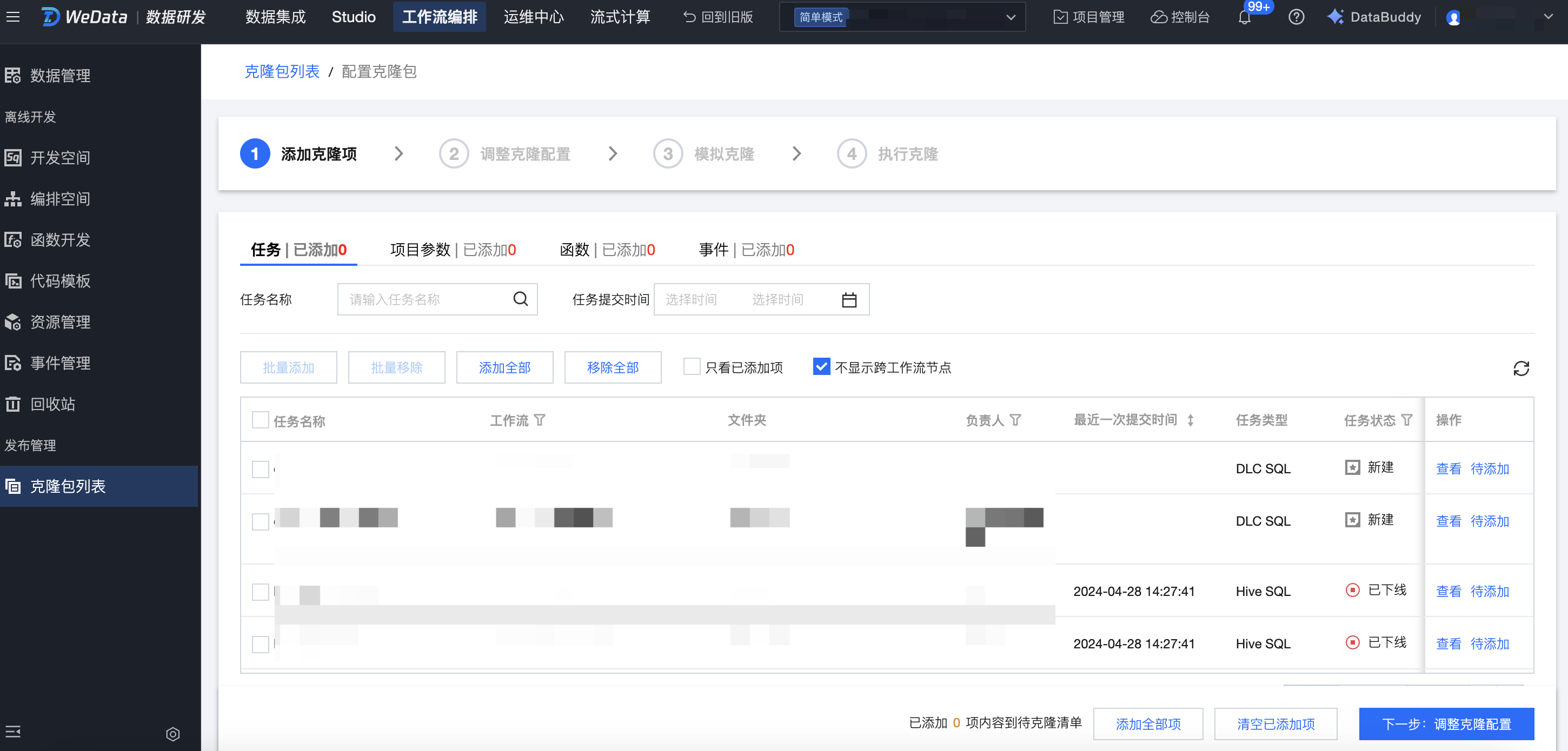 2 | 批量添加/移除:当用户在同一个克隆项分类中选择多条内容时,可以一键添加/移除选中的内容。 添加/移除全部:用户可以一键添加/移除项目内同一个克隆对象分类中的所有内容。 批量修改资源组:选中多条任务,批量修改资源组。 支持查看和待添加两种操作: 查看:用户可以单击查看,可以跳转至对应工作流、项目参数、函数及事件详情。 待添加/移除:用户可以对列表中的工作流、项目参数、函数及事件进行单独添加或移除操作。 |