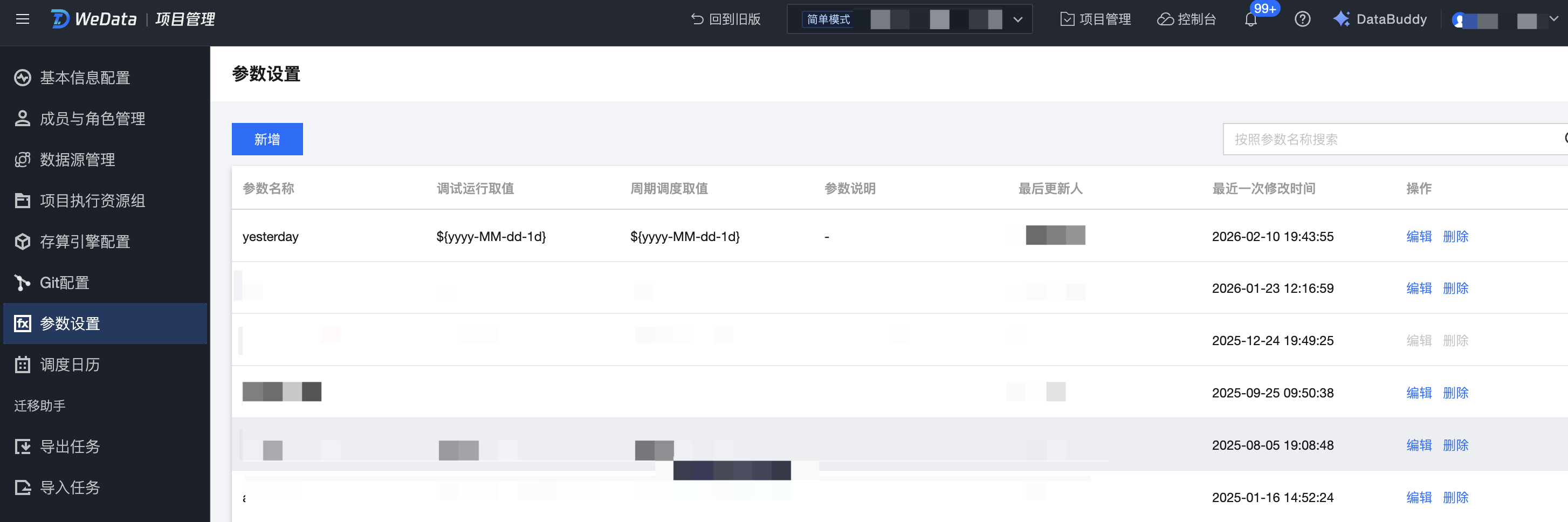在源项目的项目管理-参数设置中创建项目可用的调度参数。例如,这里在开发环境中创建了取值为 ${yyyy-MM-dd-1d} 的日期参数 yesterday。