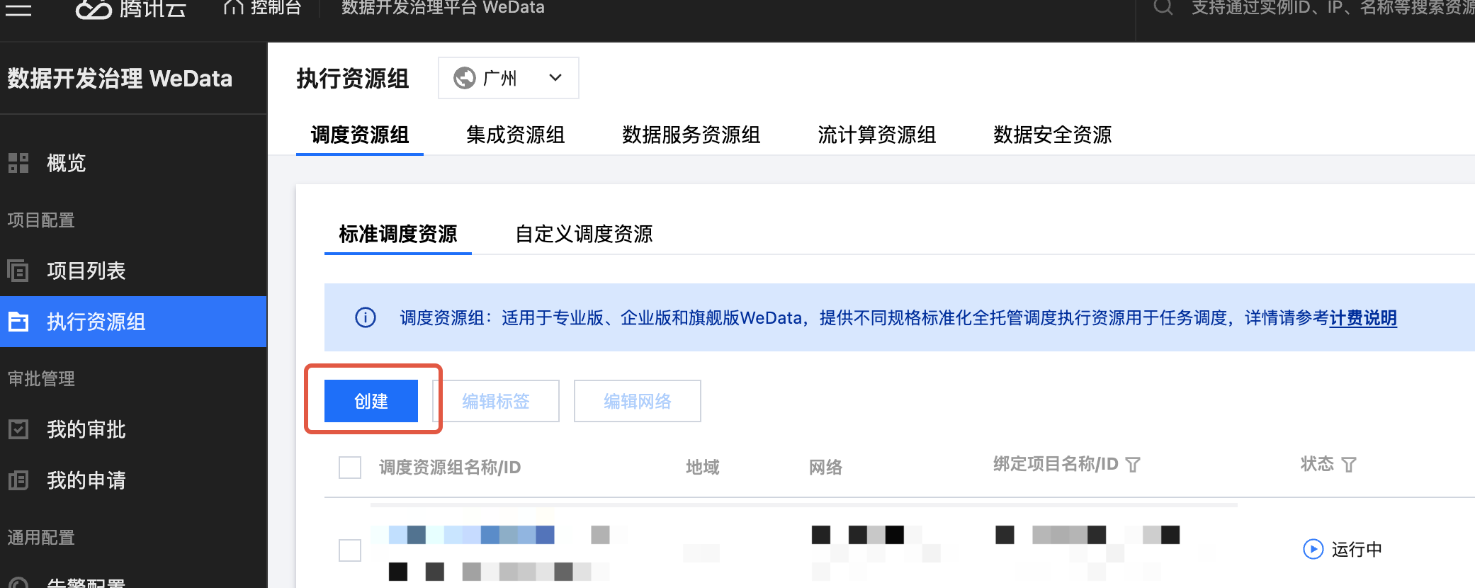 3. 单击左侧执行资源组,创建开发项目使用的资源组以及生产项目使用的资源组,并关联到对应项目。有关调度资源组创建、关联项目,请参考 调度资源组配置。
