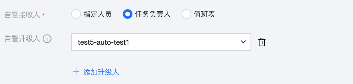 | 告警升级人 | 在告警接收人选择指定人员或任务负责人选项时,支持添加告警升级人。告警升级人支持通过下拉框添加项目内成员,最多添加5人。 如果告警接收人或上级升级人在告警间隔时间内未在运维中心的告警信息中确认该条告警,则系统会将告警发送给下一级升级人。告警升级人的上下级顺序依据配置时的上下位置确定。 ![]() |