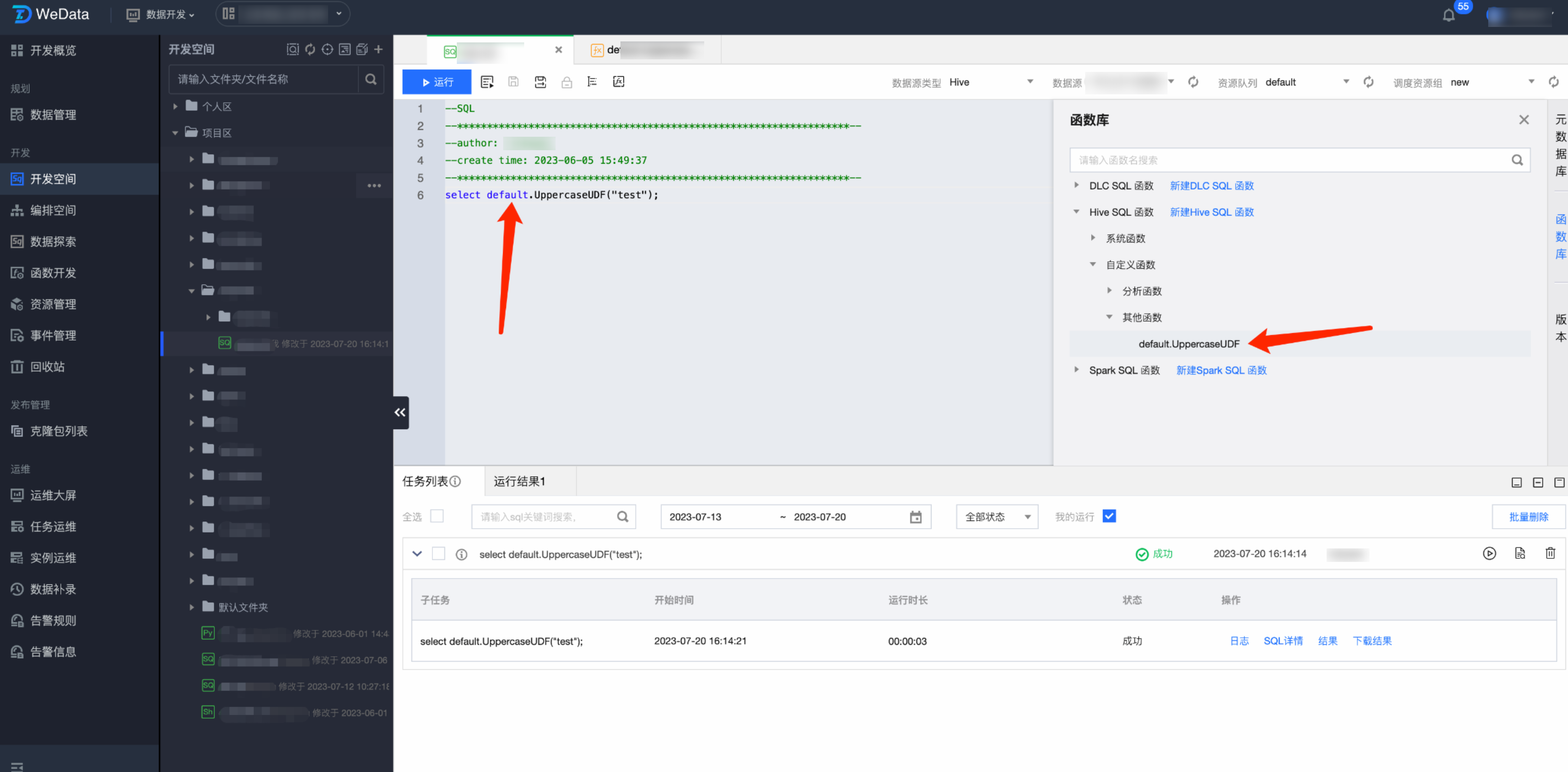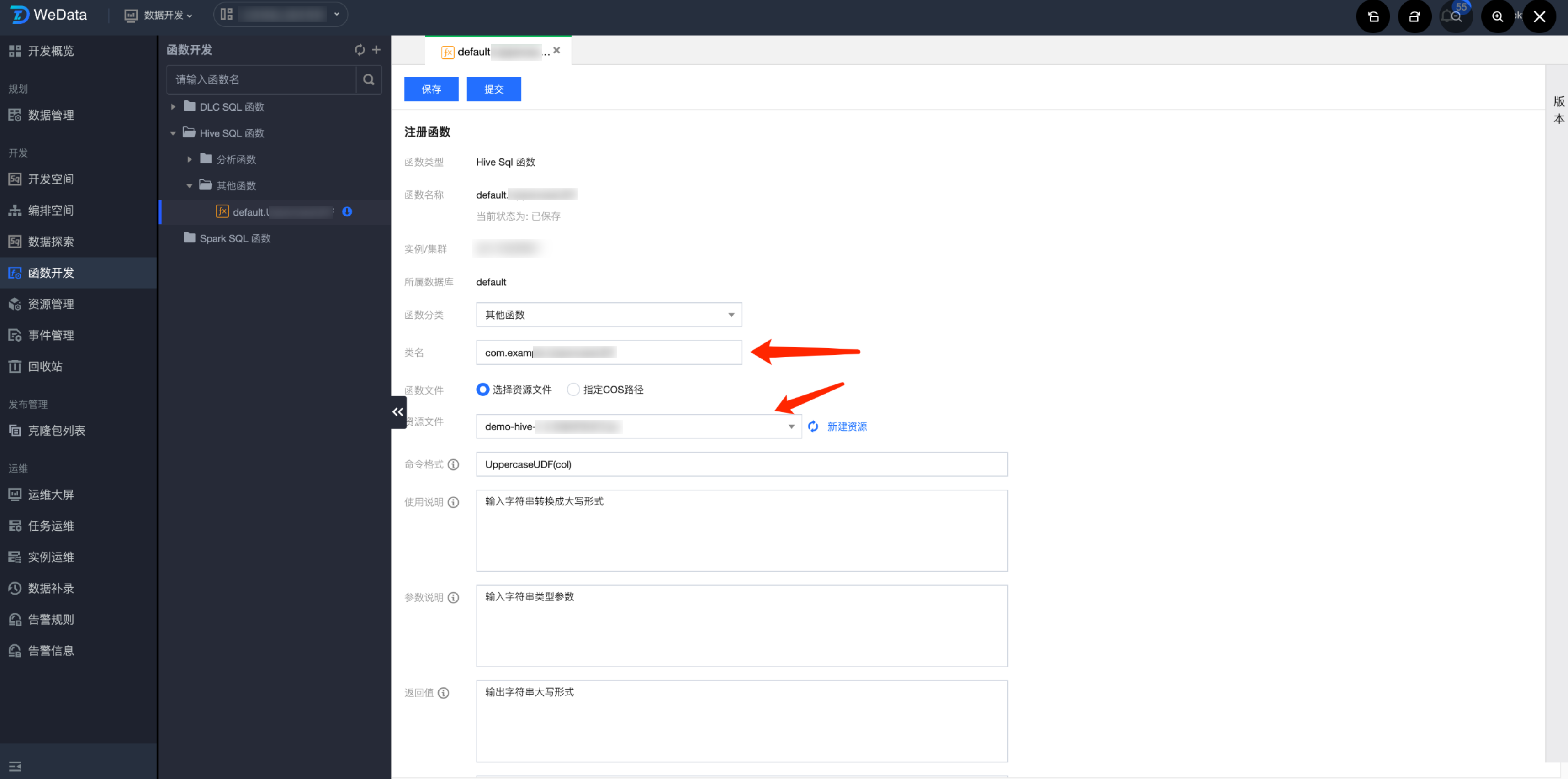 资源管理功能中上传的 UDF 函数可以在函数开发中使用,通过函数分类、类名、标明用法后,即可在数据开发过程中使用。目前支持 Hive SQL、Spark SQL 与 DLC SQL 类型函数创建。