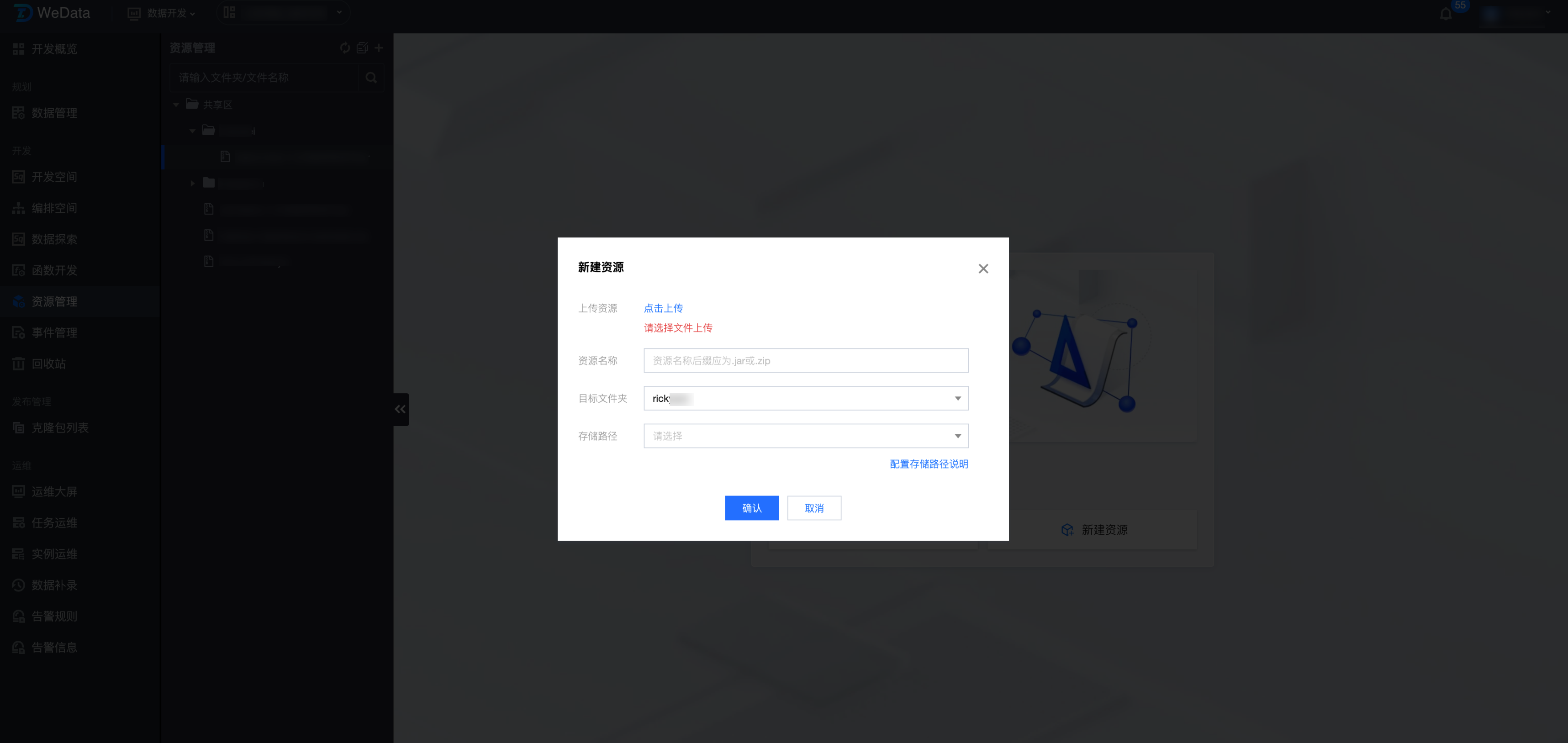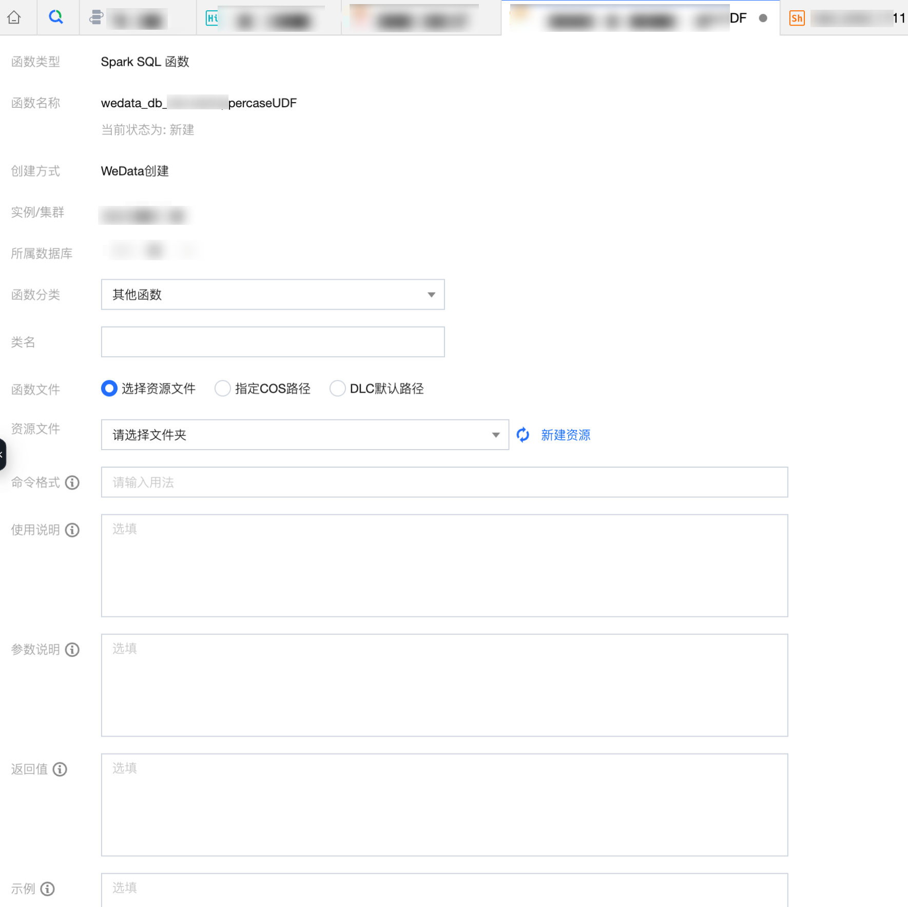 进入 WeData 函数开发页面,创建自定义函数,填写函数类全路径名:com.example.UppercaseUDF,选择对应的资源文件,即实现自定义函数编码的 jar 包,如果没有资源文件,则进行资源的创建。