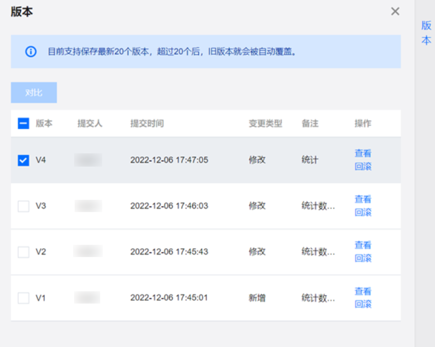 3. 函数变更后可以通过版本功能保存下历史记录,包括版本号、提交人、提交时间、变更类型、备注,并且支持回滚历史版本的操作。