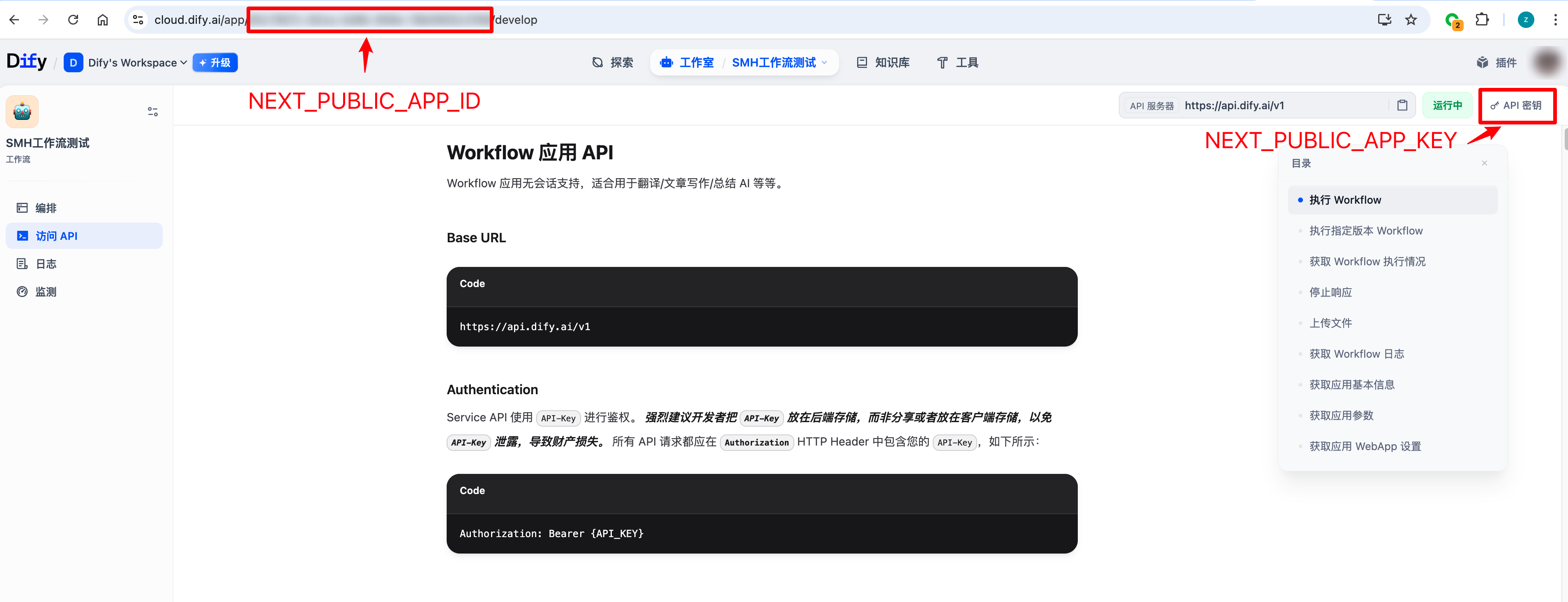 2. 登录 Dify 控制台,检查您的应用是否已发布,API Key 是否有权限。