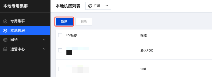 2. 在左侧导航栏选择本地机房,单击新建,进入本地专用集群创建机房页面。
