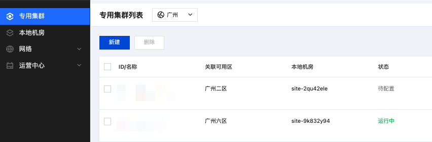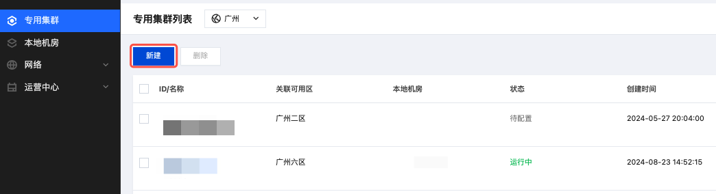 2. 在左侧导航栏选择专用集群,单击新建,进入本地专用集群创建集群页面。