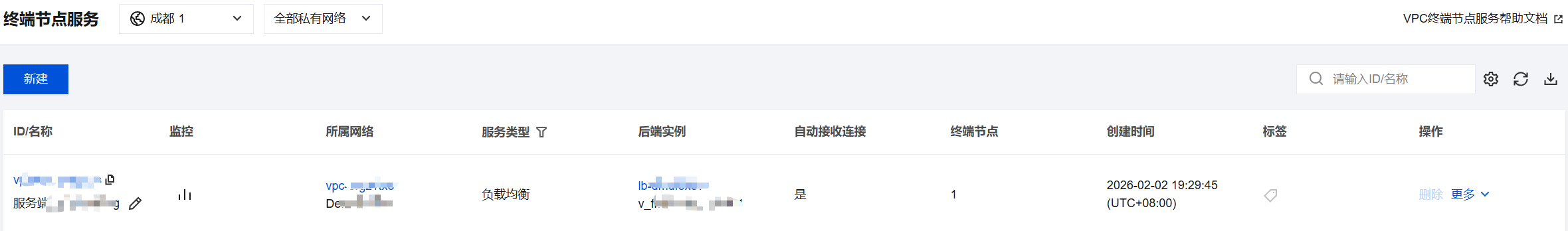 4. 单击确定,创建成功的终端节点服务展示在列表中。