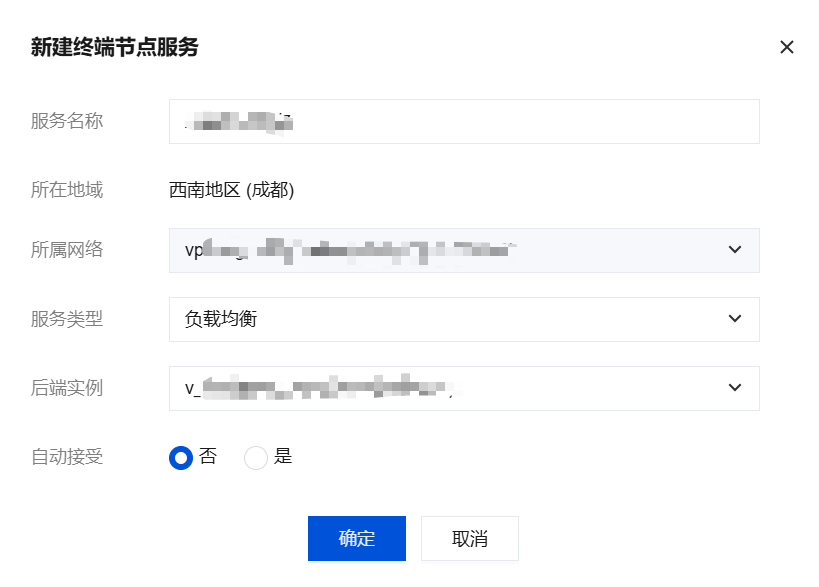 自动接受 | 指定终端节点服务是、否自动接受终端节点发起的连接请求,默认为否: 当选择是自动接受时,终端节点服务默认接受所有连接的终端节点的请求,终端节点创建成功后,状态即为可用。 当选择否不接受自动连接时,终端节点初始连接状态将为待接受,需要终端节点服务手动执行接受连接才能将状态从待接受变为可用。 |