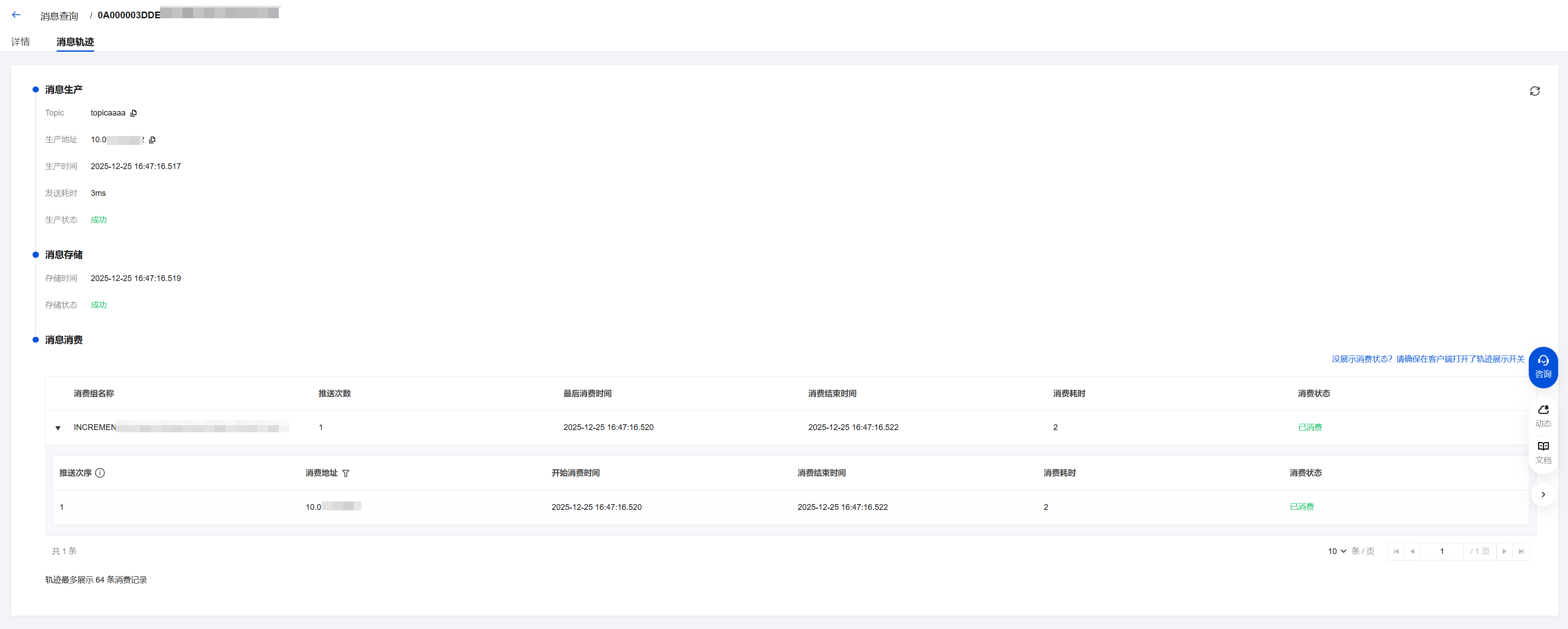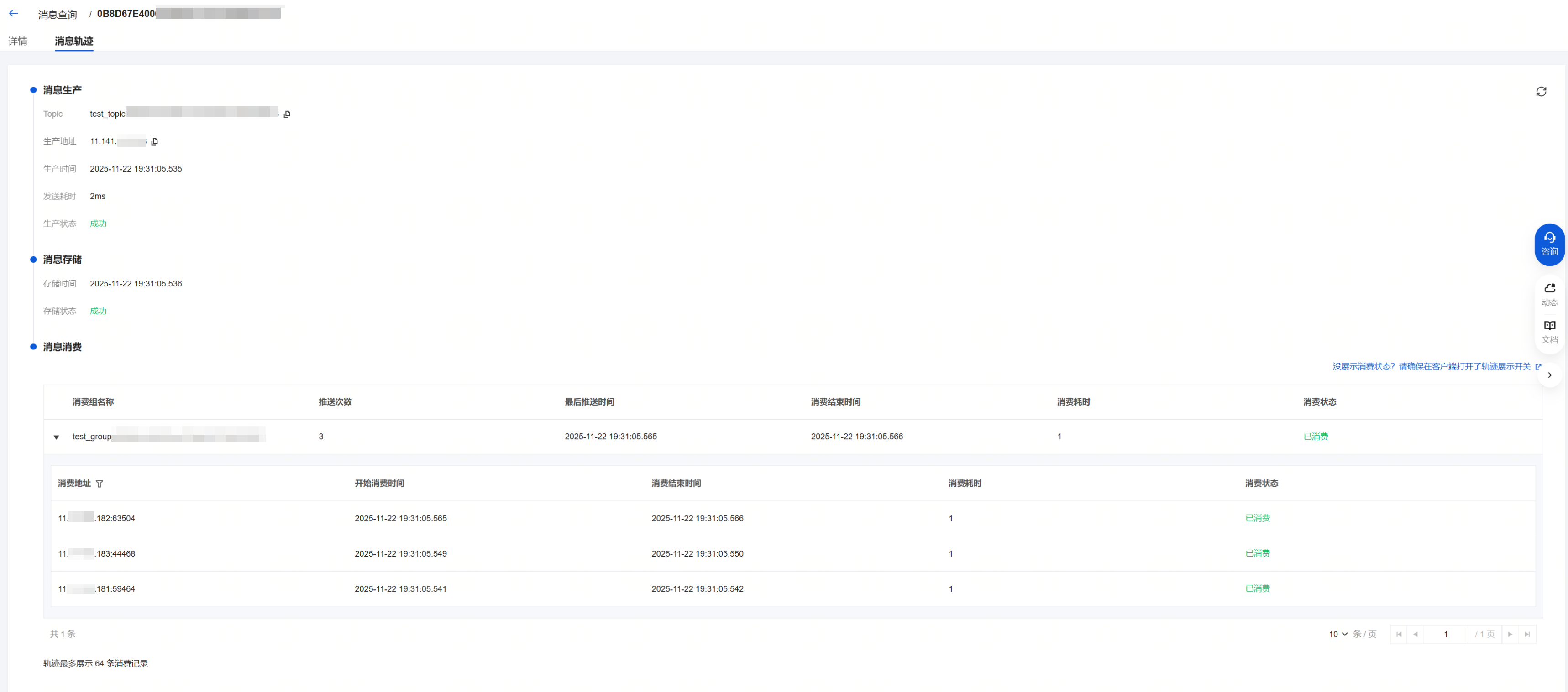 消费地址 | 收到消息的消费者地址及端口。 |