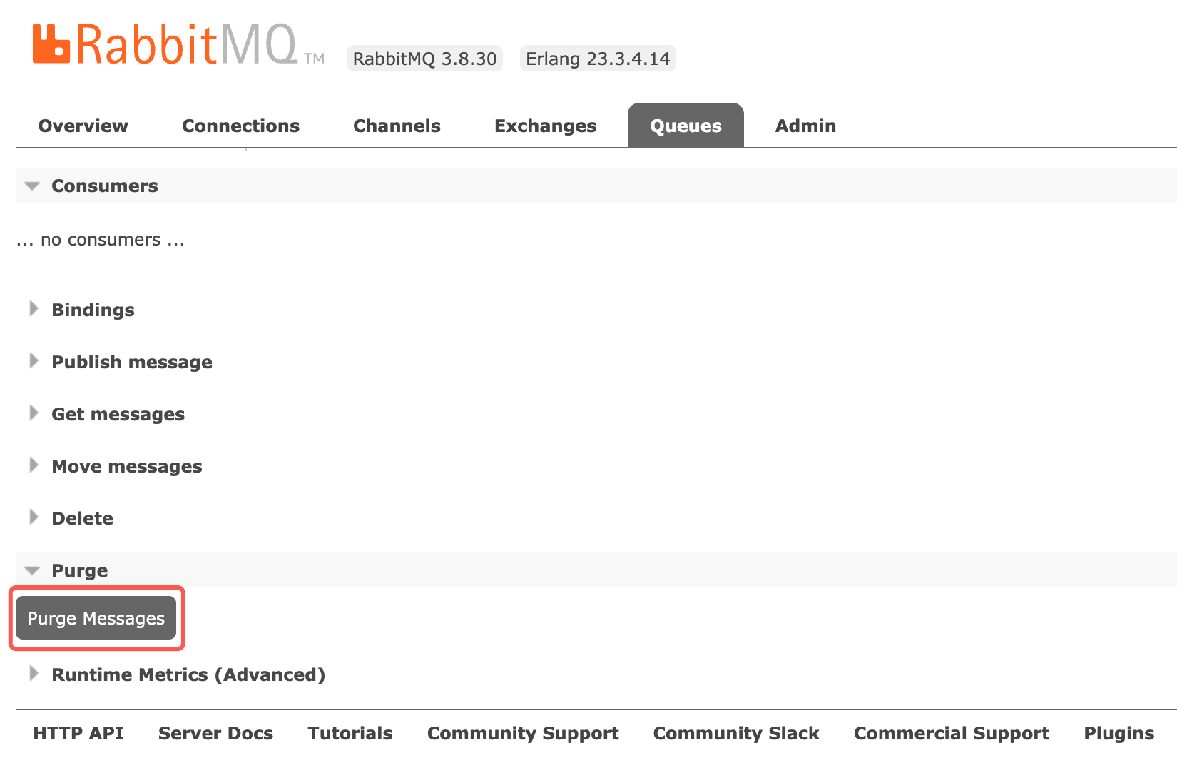 3. 在页面中找到 Purge,单击 Purge Messages,再单击确认。