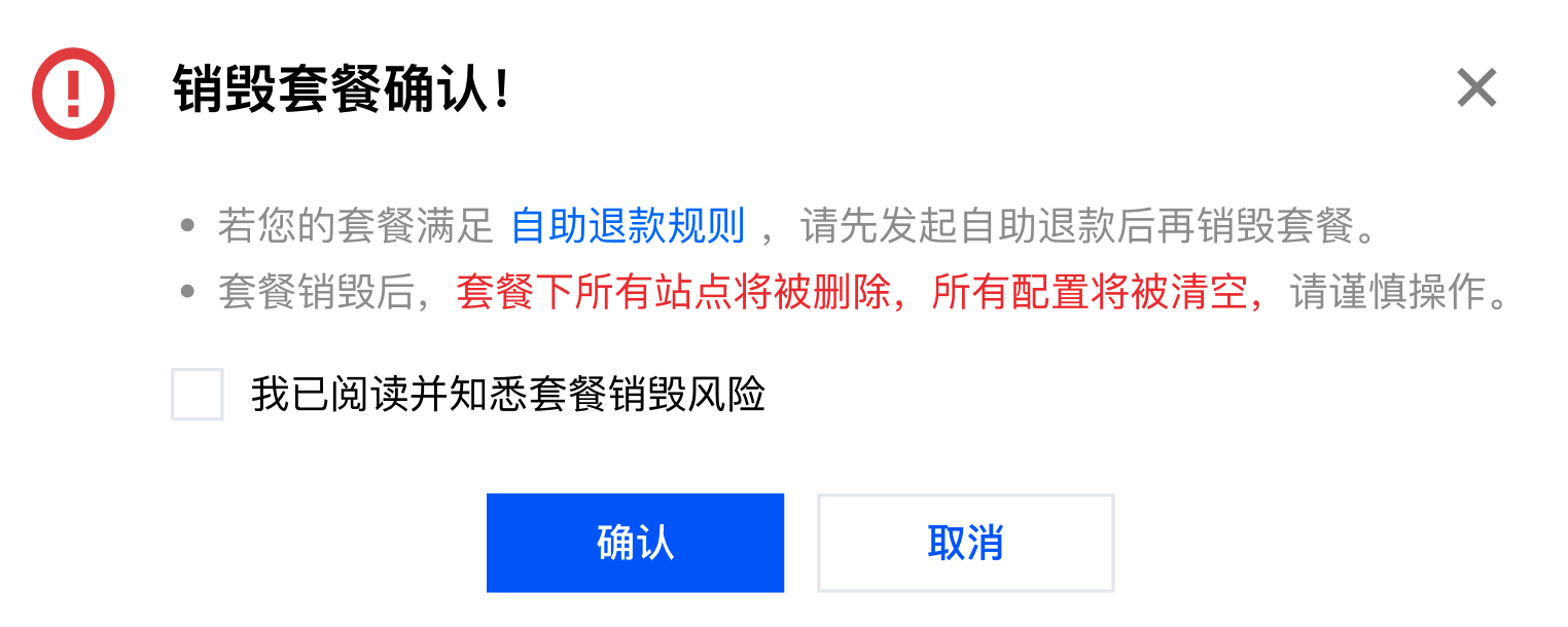 3. 勾选“我已阅读并知悉套餐销毁风险”并点击“确认”后,套餐即可完成销毁,同时套餐下站点也将被删除,所有配置将被清空。