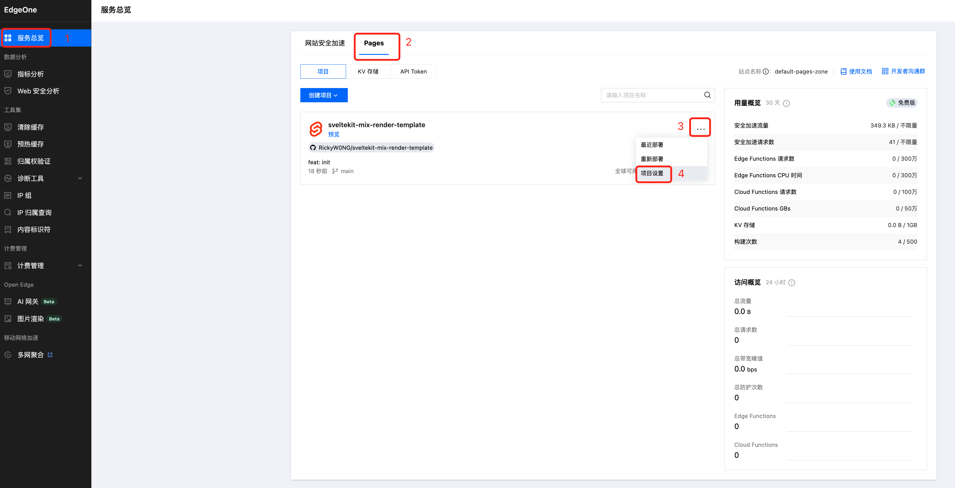 1. 前往 EdgeOne 控制台 > 服务总览,切换到 Pages 项目,点击...选择“项目设置”。