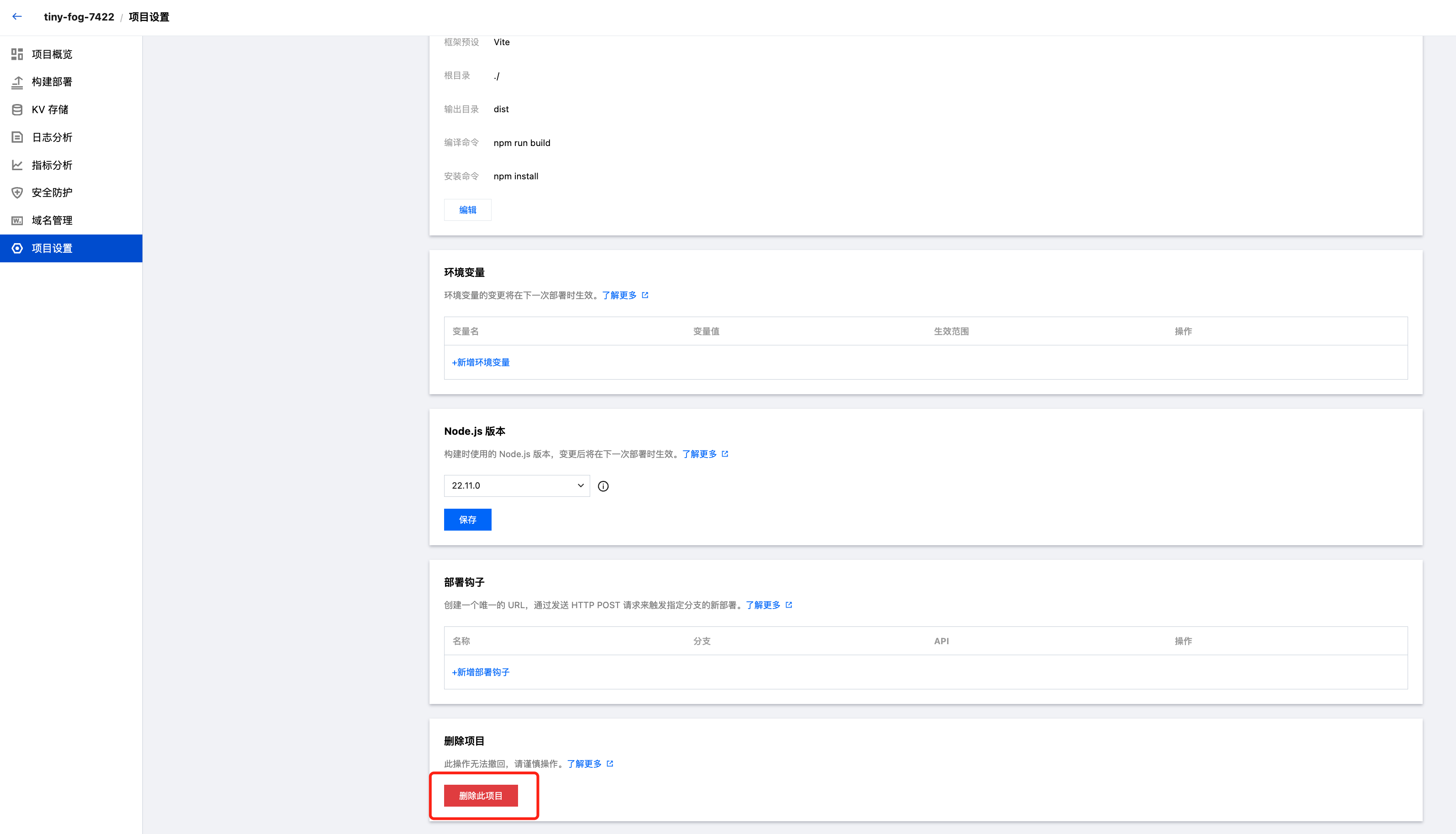 2. 进入“项目设置”页面后,将页面滚动到最底部找到“删除此项目”。