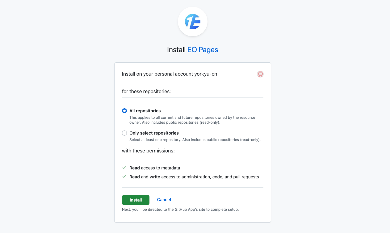授权 GitHub:授予 EdgeOne 访问您仓库的权限。