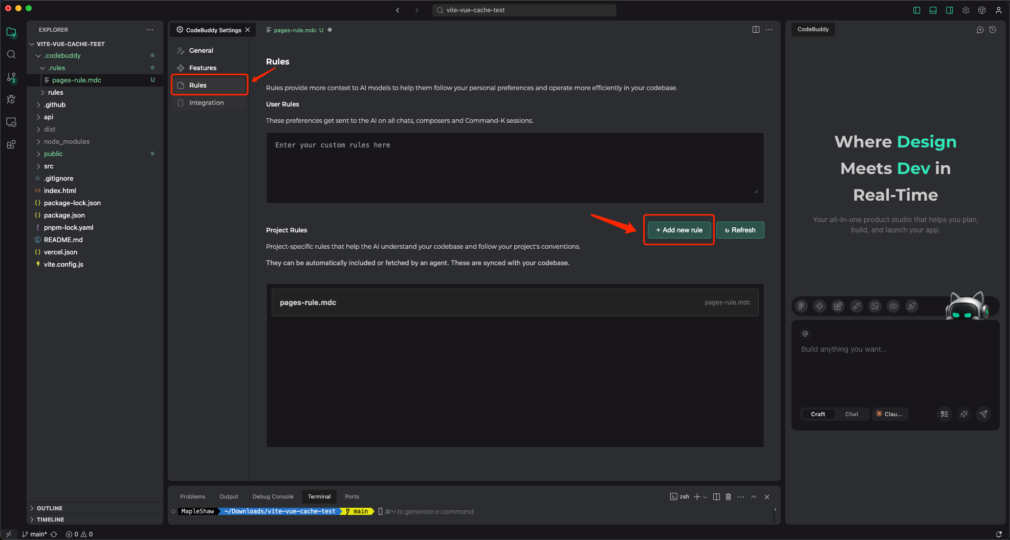 在使用 CodeBuddy 进行开发时,特别是针对全栈项目,我们强烈建议您配置 EdgeOne Pages Rules(pages-llms.mdc),让 AI 懂得如何编写更符合 Pages 规范的代码。