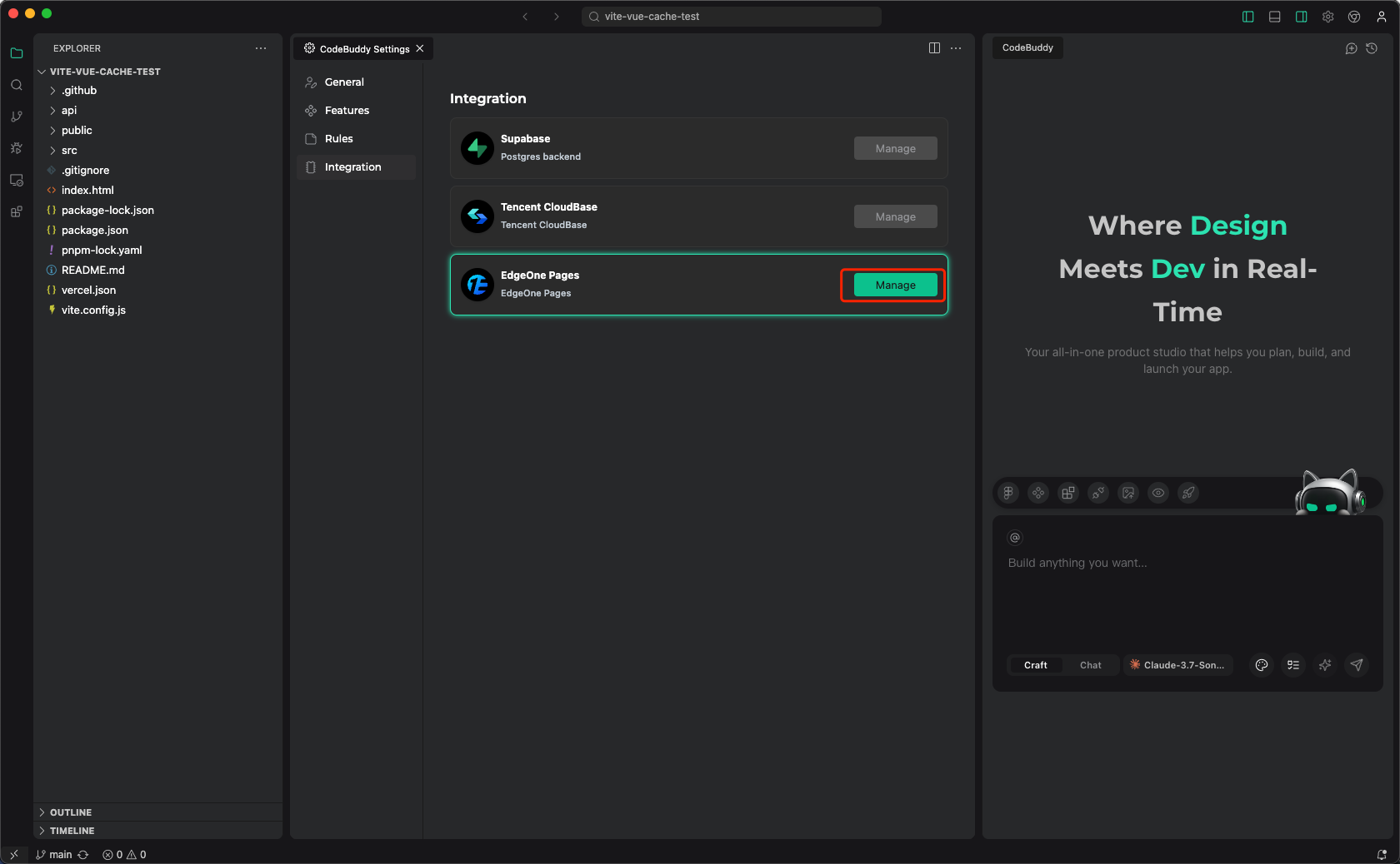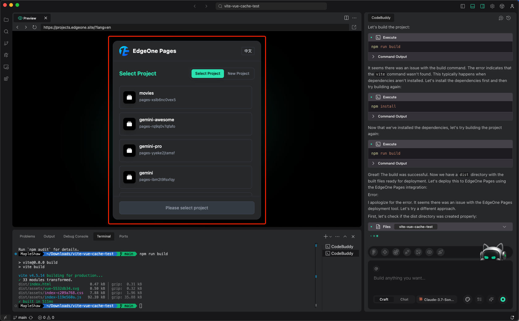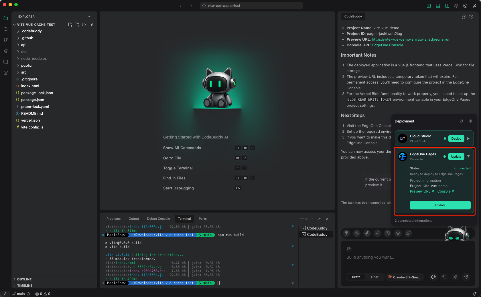 通过本章节的指南,您可以在 CodeBuddy IDE 里面集成 EdgeOne Pages 的快速部署能力,在开发过程中实现一键构建并部署至 Pages。