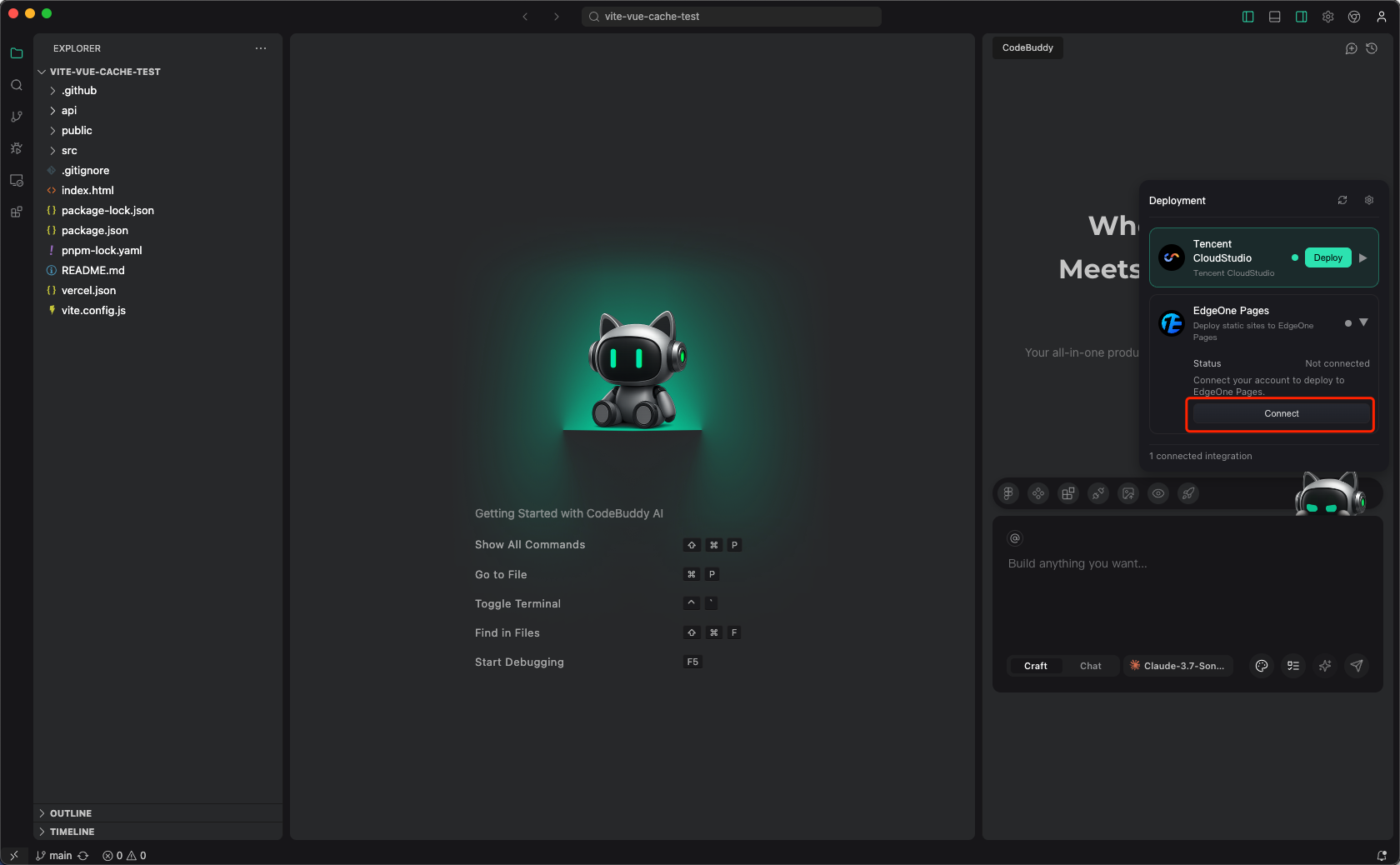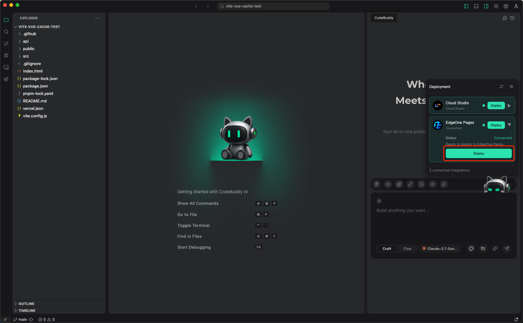 在 CodeBuddy IDE 里面单击Deploy,选择 EdgeOne Pages 进行连接。