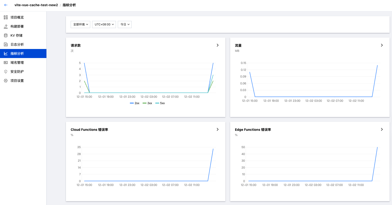 指标分析功能提供了对 Pages 项目关键性能指标的监控与分析能力。您可以从账号维度或项目维度,深入洞察业务的运行状态与安全状况。通过对关键指标的实时监控,可快速识别问题、优化资源配置,从而提升业务的稳定性与安全性。