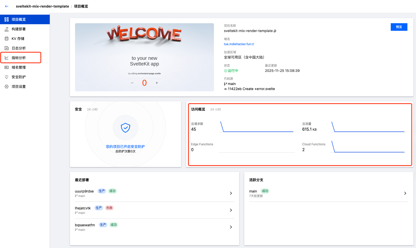 在项目详情页的“访问概览”中,可查看当前项目的总请求数、总流量、Edge Functions 及 Cloud Functions 调用等基本数据。