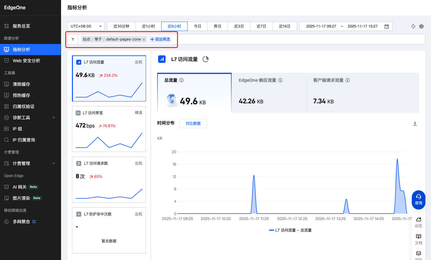 如需查看更详细的数据分析,可从 Pages 控制台首页的站点名称处,跳转至 EdgeOne 的数据分析 > 指标分析模块。