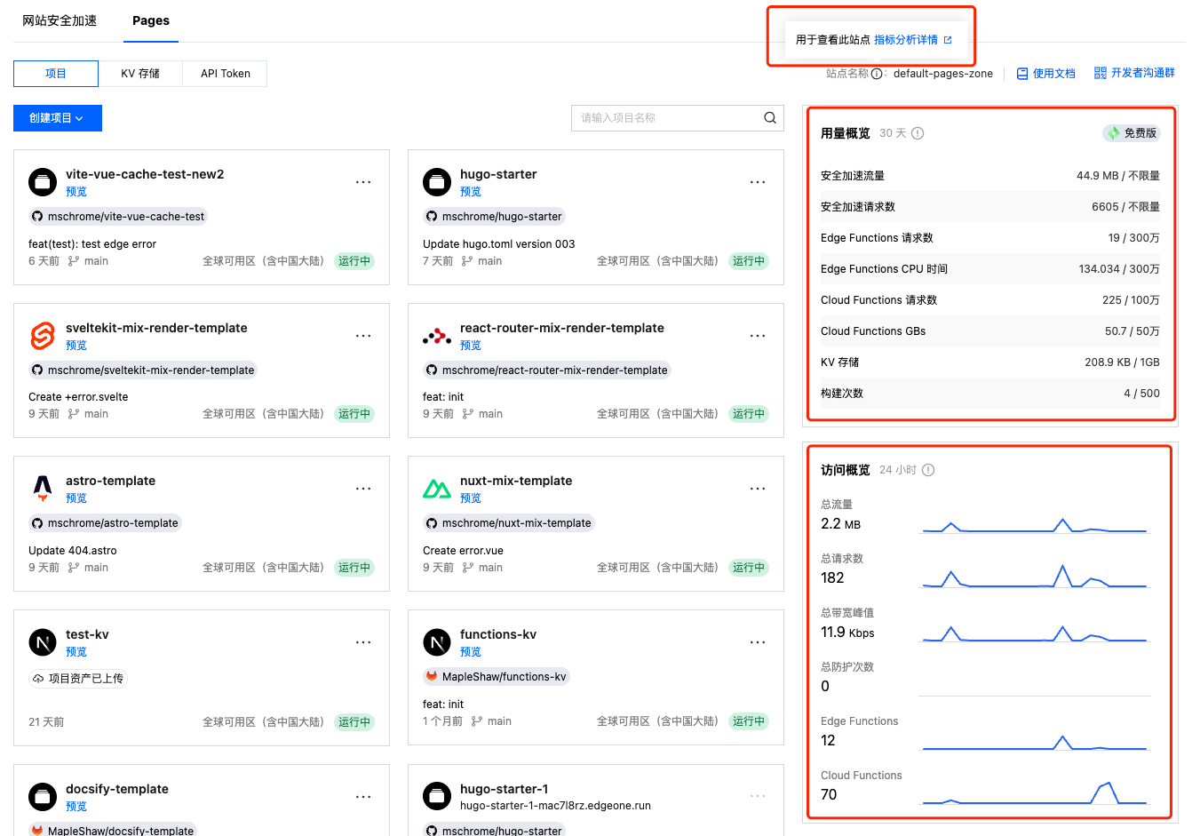 注意:站点(default-pages-zone)包括当前 Pages 账号下所有项目,平台以该粒度提供不同版本的套餐(目前已推出免费版)。