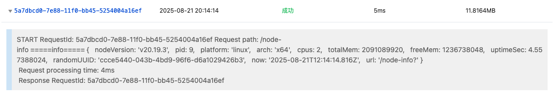 export const onRequestGet = async ({ request }) => {const info = {nodeVersion: process.version,pid: process.pid,platform: os.platform(),arch: os.arch(),cpus: os.cpus()?.length ?? 0,totalMem: os.totalmem(),freeMem: os.freemem(),uptimeSec: process.uptime(),randomUUID: randomUUID(),now: new Date().toISOString(),url: request.url,}console.log('=====info=====', info); // 自定义日志return new Response(JSON.stringify(info), {status: 200,headers: { 'Content-Type': 'application/json; charset=UTF-8' },})}