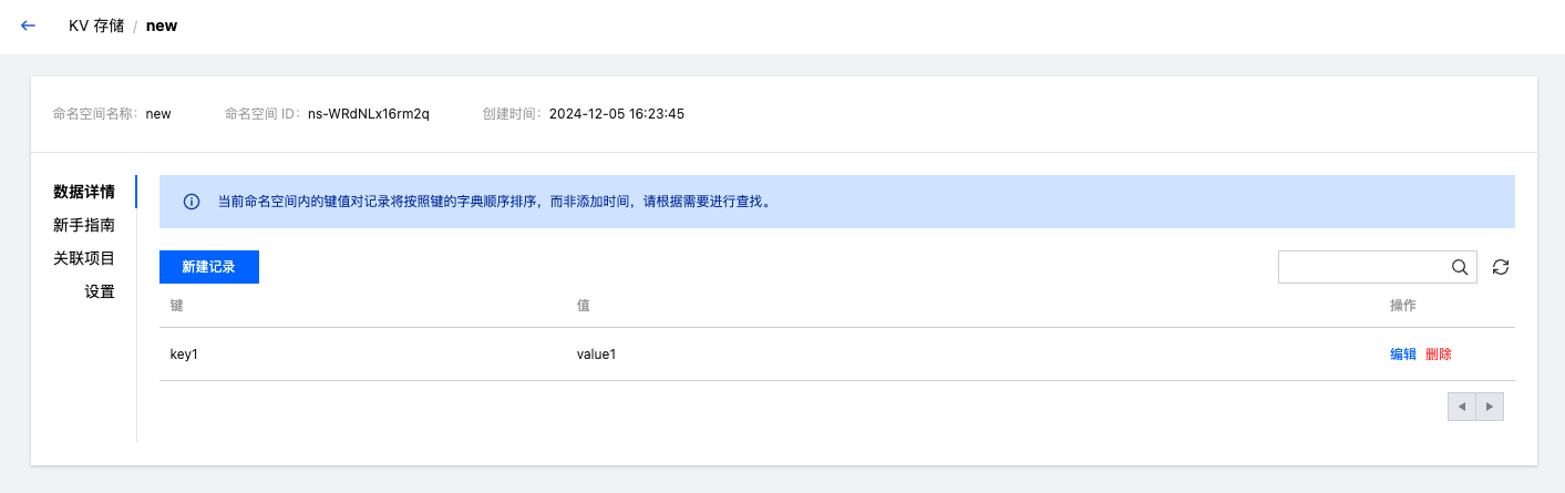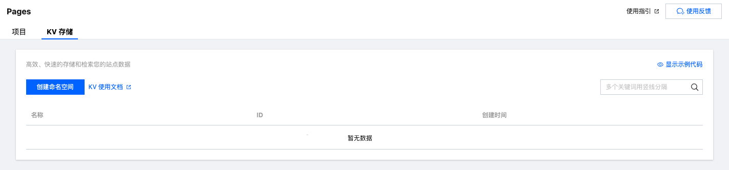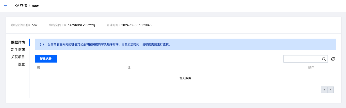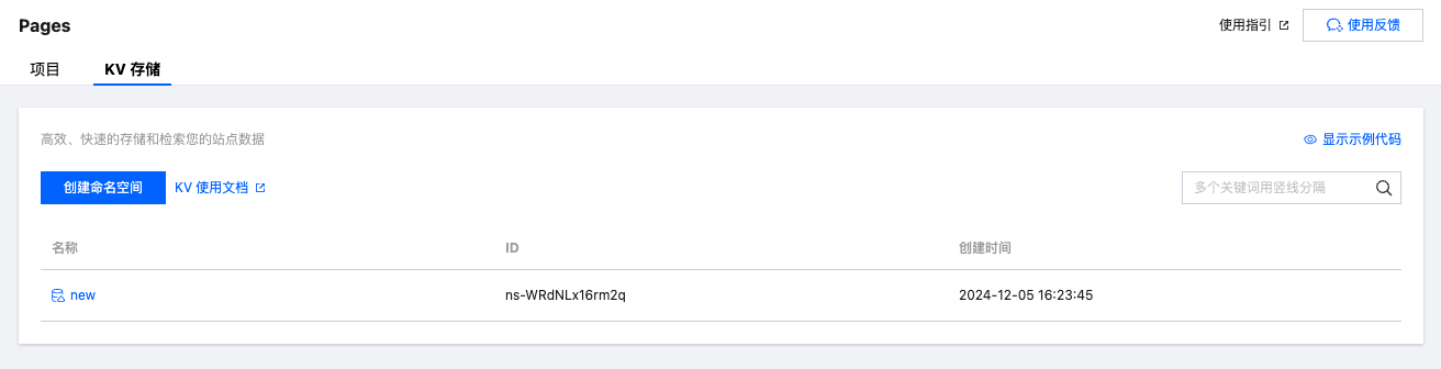 1. 进入命名空间列表:开通 KV 账户后,在“KV存储”页面,单击创建命名空间。