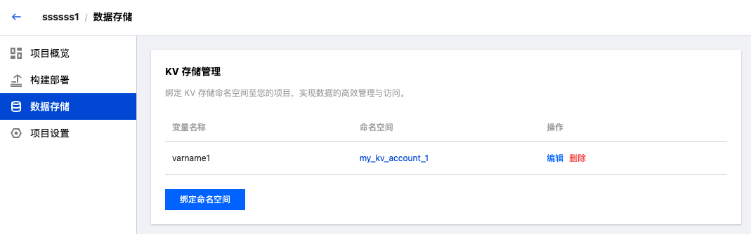 变量名是绑定项目和命名空间时定义的运行时环境变量名称。 在使用命名空间数据之前,需要先将命名空间跟 EdgeOne Pages 项目进行绑定。命名空间跟项目的绑定关系为多对多,在绑定时通过不同的运行时环境变量名称来区分使用。