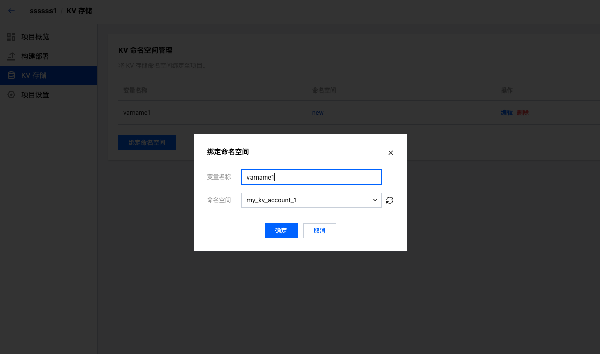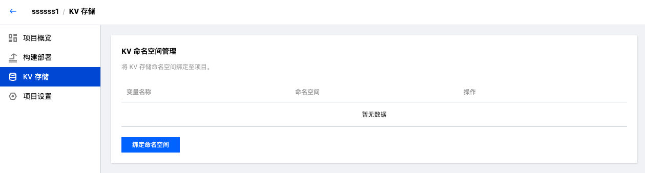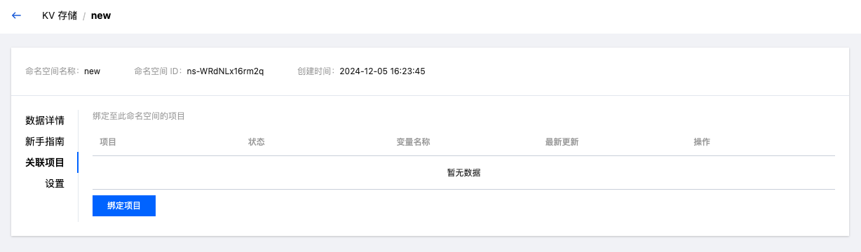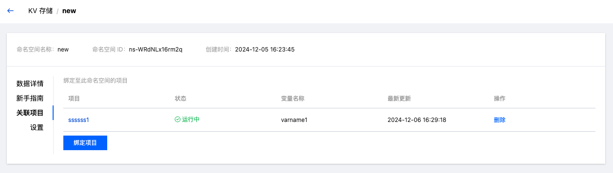 命名空间与项目间的绑定,在“项目”和“KV存储”中,都可以进行绑定。