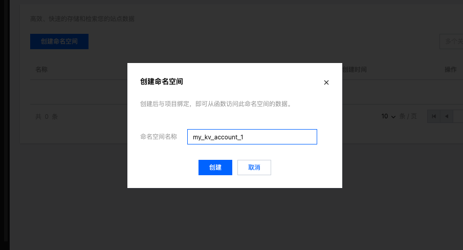 命名空间(namespace)是 EdgeOne Pages KV 中数据隔离的基本单位。每个命名空间可以看作是一个独立的 database,各个命名空间之间的数据互不干扰。一个账户可以创建 10 个命名空间。