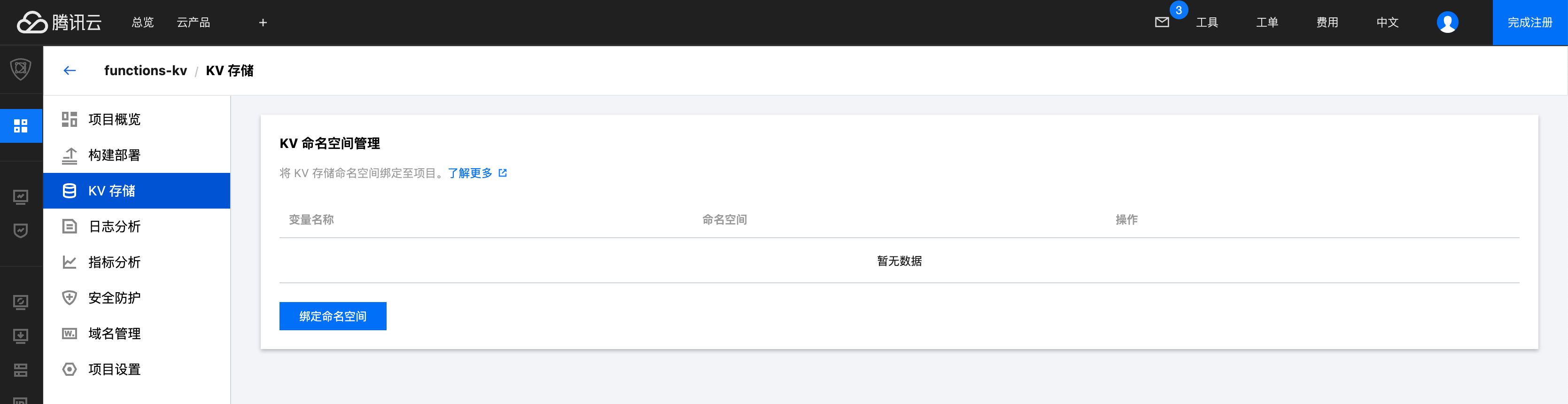 部署完成后在左侧导航栏中单击 KV 存储,在页面中单击绑定命名空间。