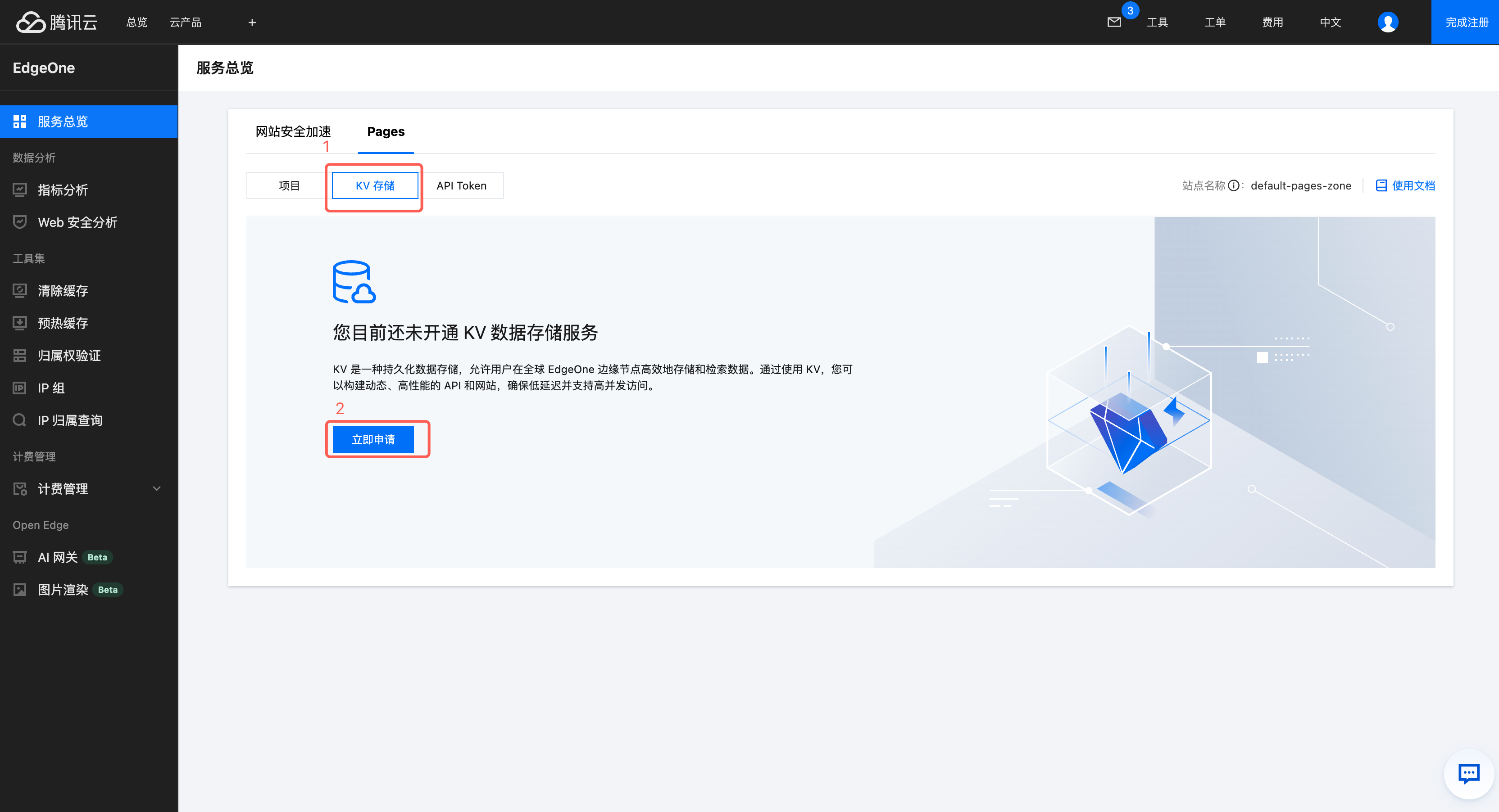 如果是第一次使用 Pages 的 KV 存储服务,建议使用我们提供的 模板 来尝试。整体操作步骤包含三步:开通 KV 存储服务、Pages 项目关联 KV 空间、在项目中使用 KV 存储,下面将详细介绍相关内容。