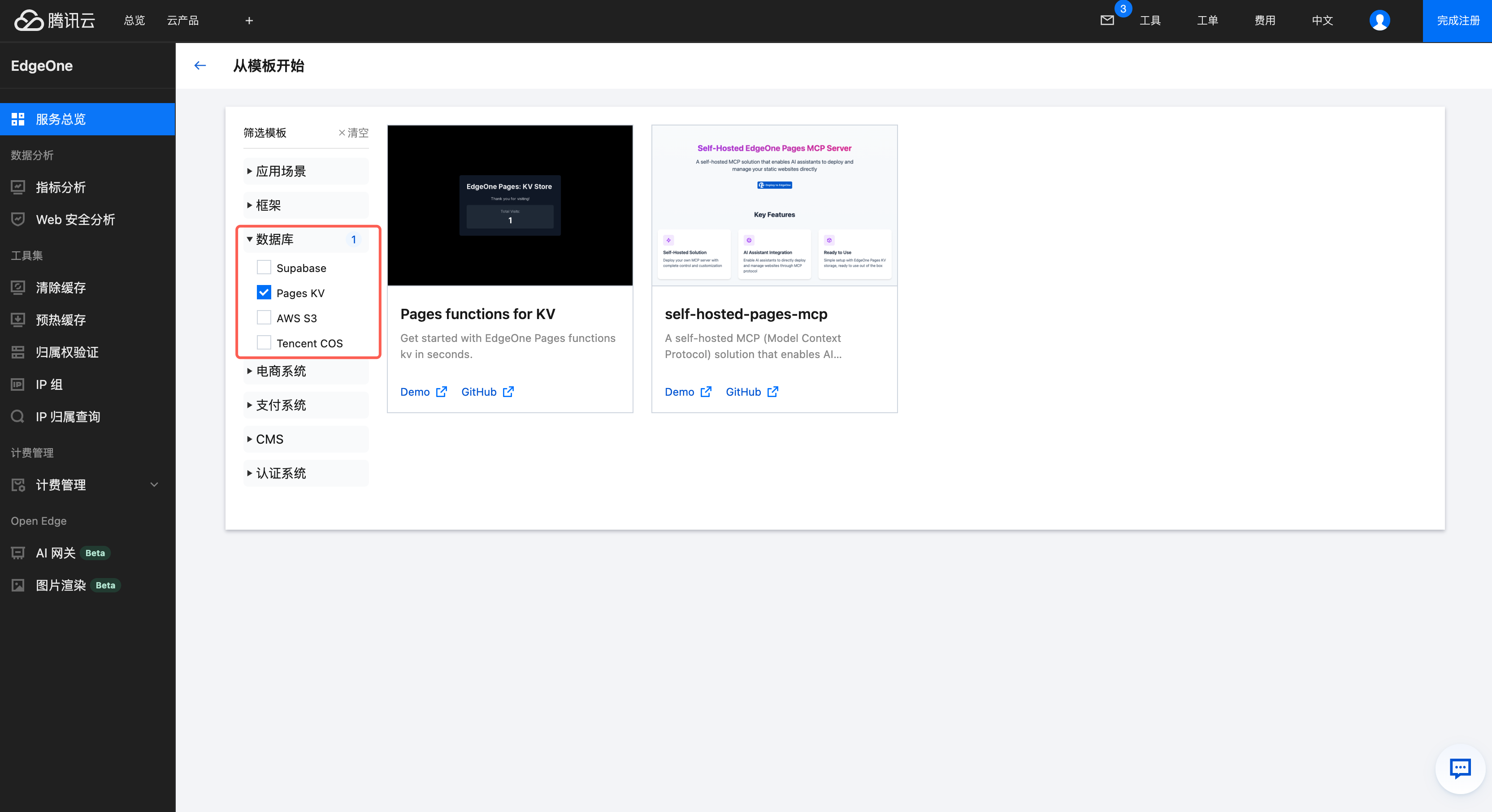 Pages Project 页面,单击创建项目 > 从模板开始。在左侧导航栏中找到数据库 > Pages KV,选择 Pages functions for KV 模板。