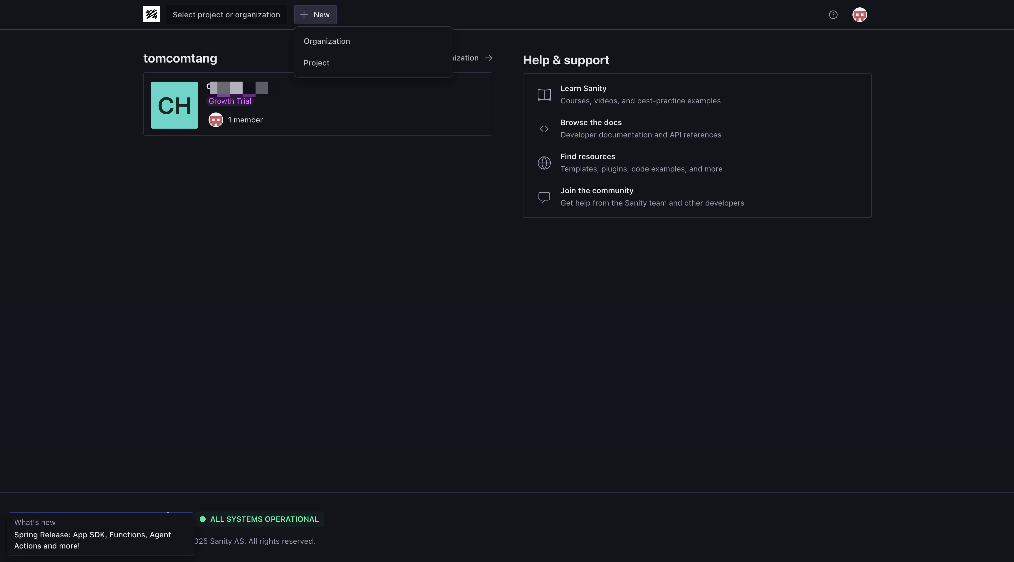 注册完成后,您需要创建一个新的 Sanity 项目。首先进入 Sanity 管理界面,在顶部导航栏找到并点击“Select a project”,在下拉菜单中选择“New project”,然后: