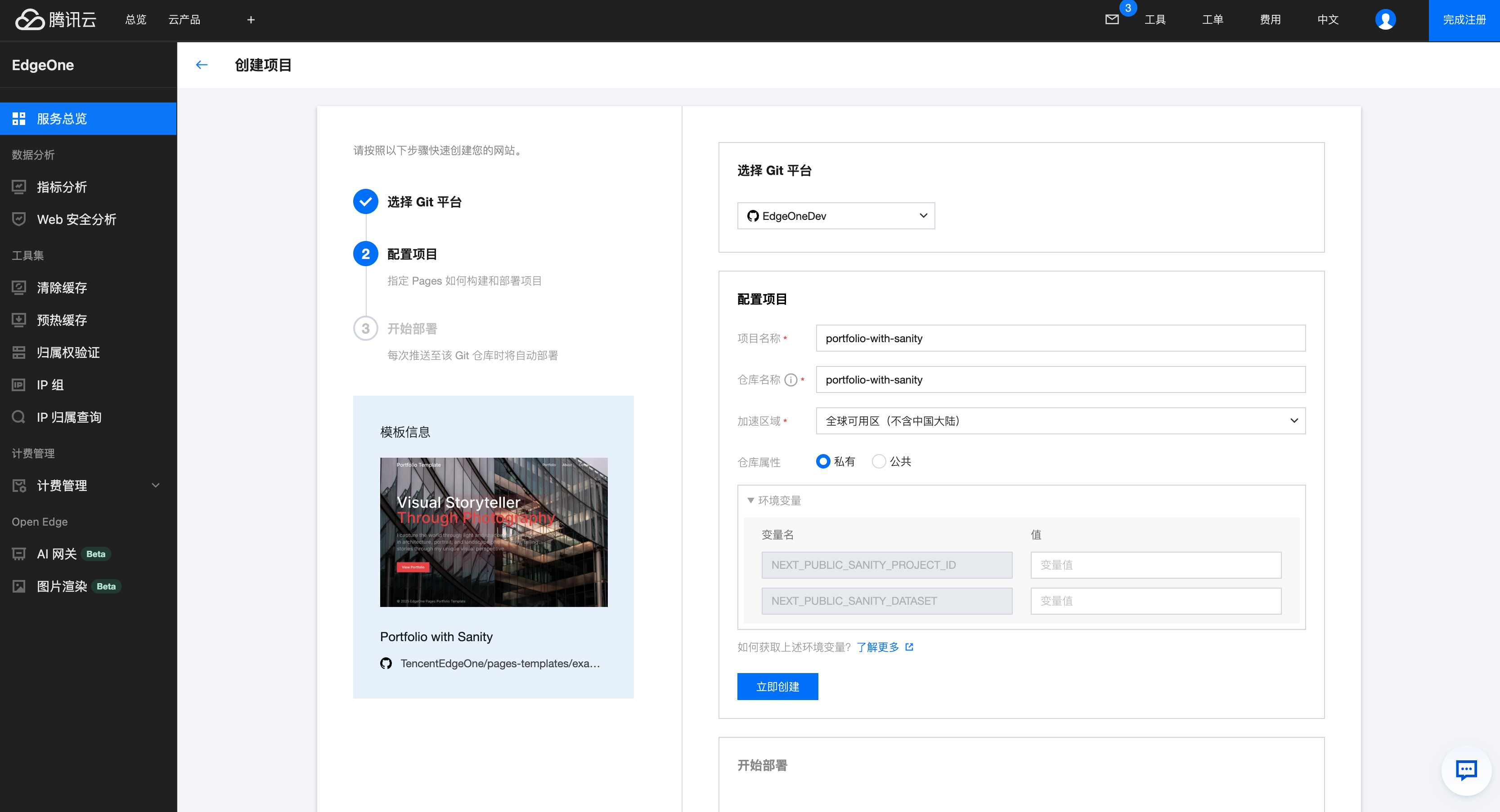 EdgeOne Pages 已经为您准备了一个基于 Next.js 的完整模板,支持增量静态再生 (ISR) 功能,在模板页面找到 Portfolio with Sanity,点击 Deploy 进入到部署页面。