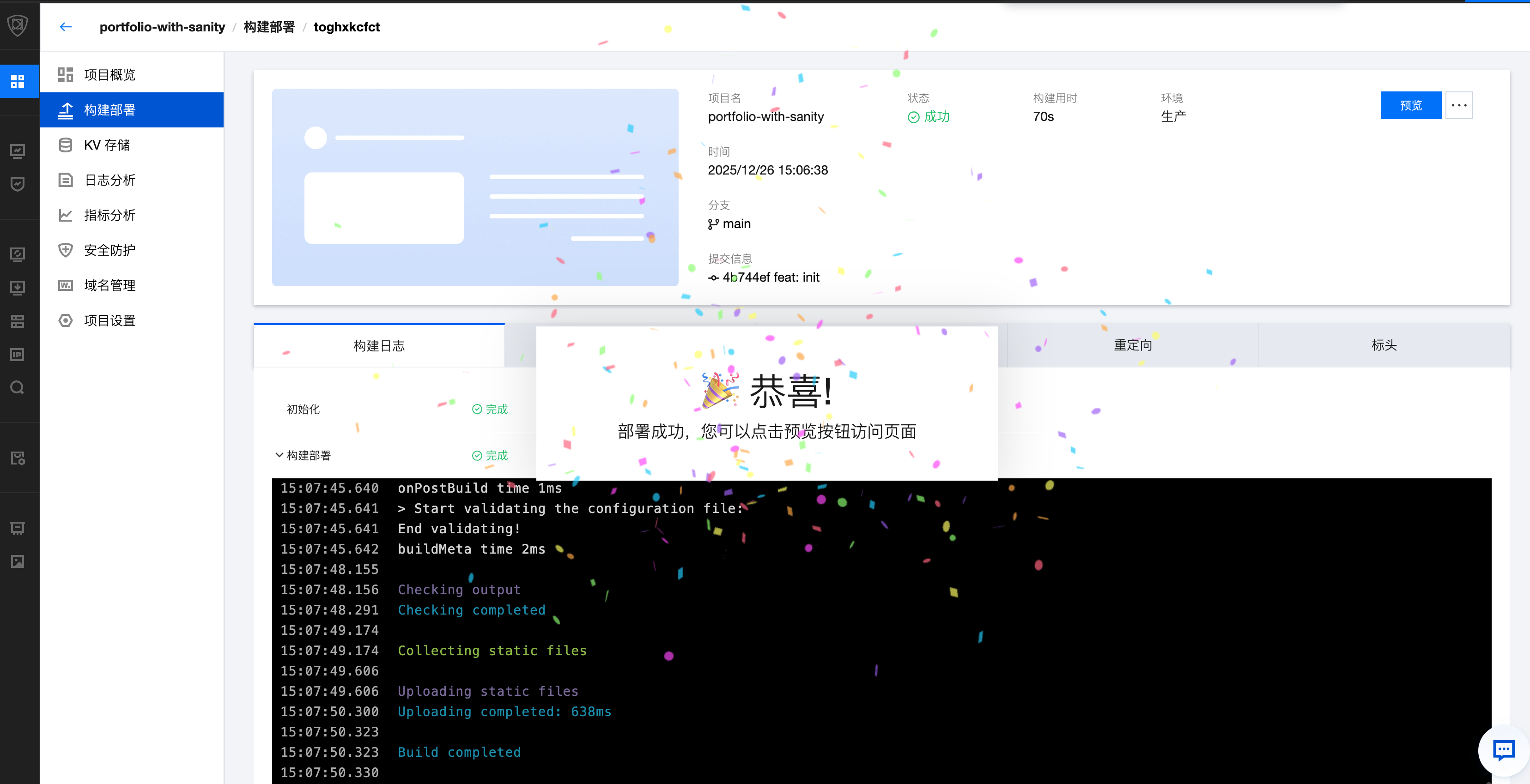 src/content/projects 的 Markdown 内容,如果不需要 CMS 进行内容管理您可以直接修改 Markdown 内容以维护内容。完成上述环境变量配置后,单击立即创建开始部署,等待部署完成后将显示部署成功界面。