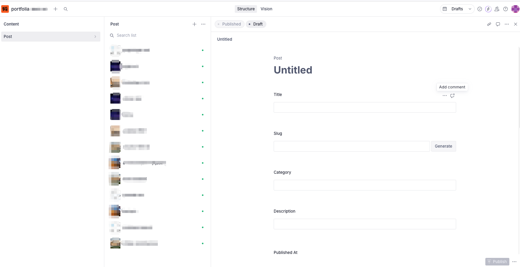 配置好上述数据模板之后 ,启动 Sanity Studio,在对应的 project 和 dataset 中配置或者增加数据,无需重新部署,项目将会看到 portfolio 数据增加或者改变。