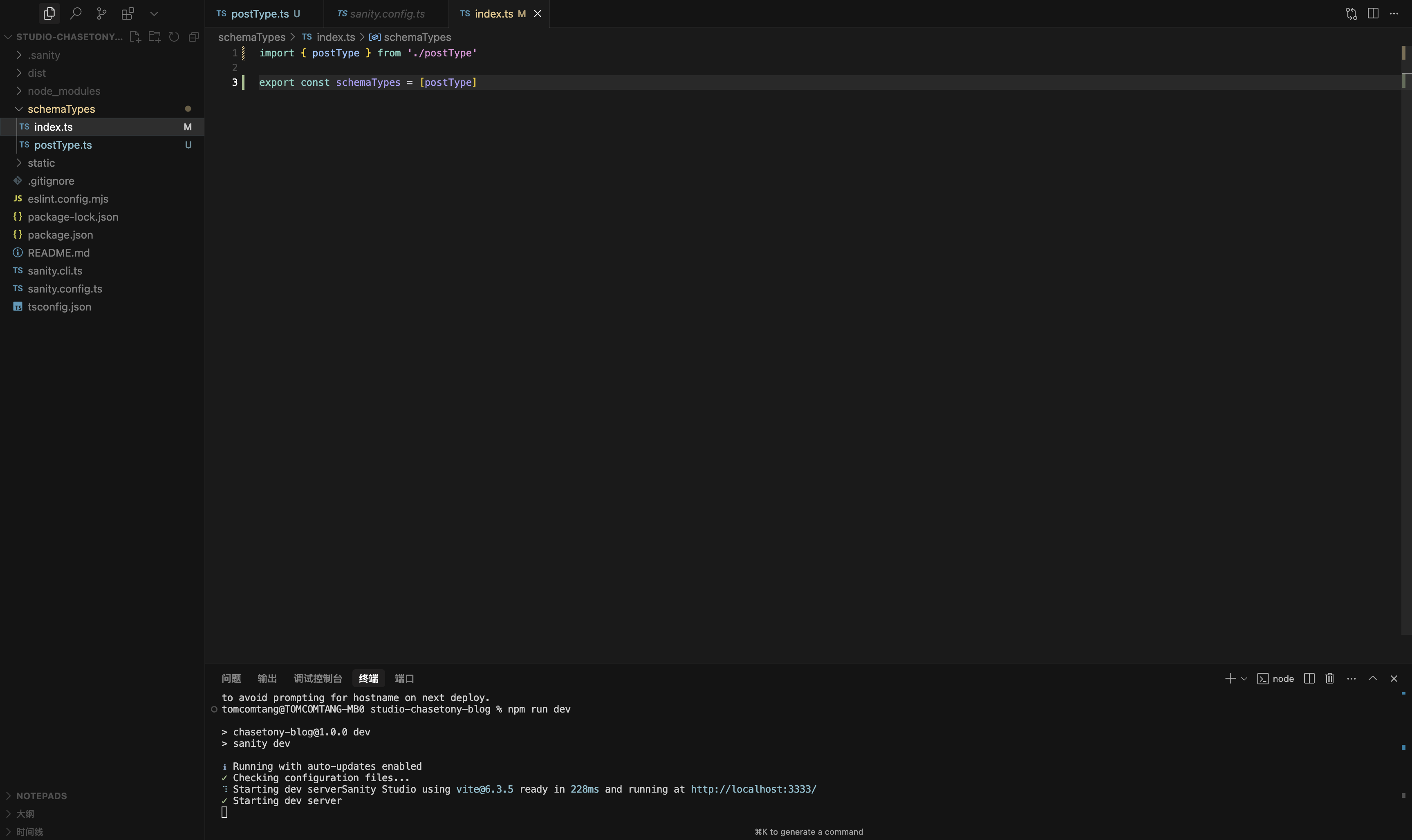 schemaTypes/index.ts 中引入这个模型:import {postType} from './postType'export const schemaTypes = [postType]