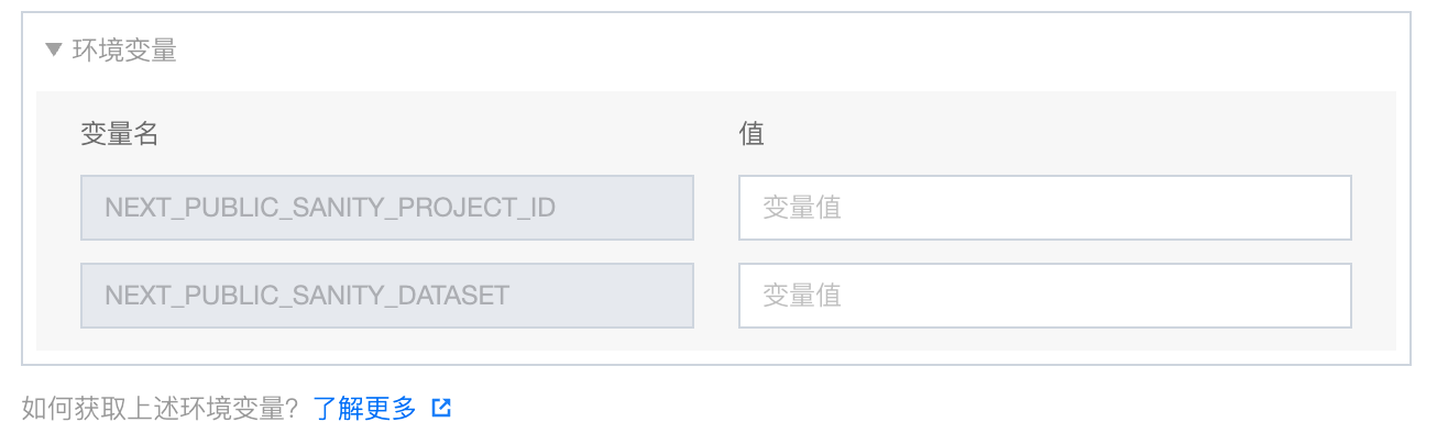 在 EdgeOne Pages 配置面板中,您需要填写两项 Sanity 相关的环境变量信息: