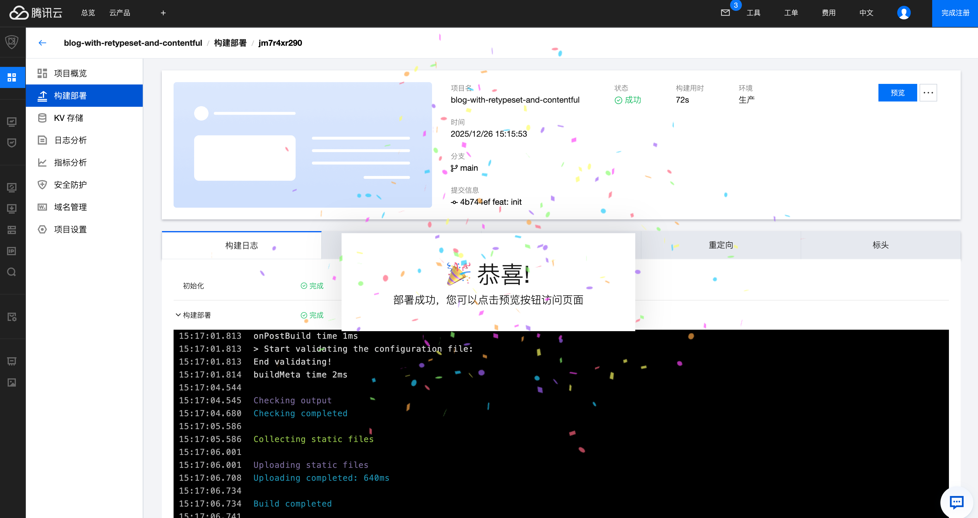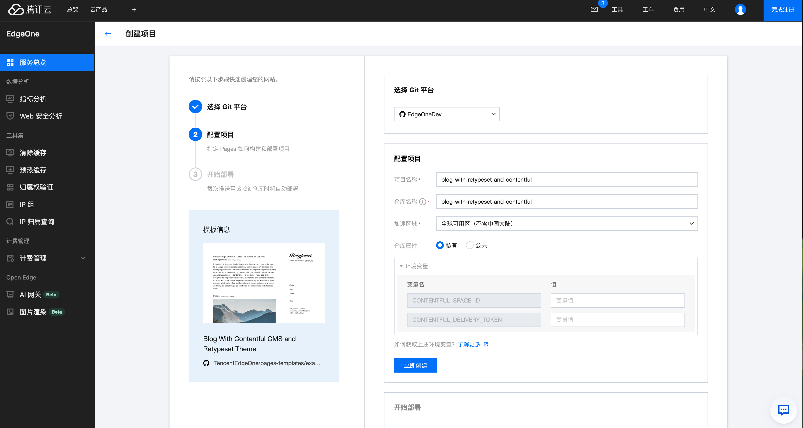 src/util/contentful.js 的代码,因为它会自动从 EdgeOne 控制台配置的环境变量中获取 Space ID 和 Access Token。这样可以避免在代码中暴露您的账户信息,保证了私密性。部署到 EdgeOne Pages