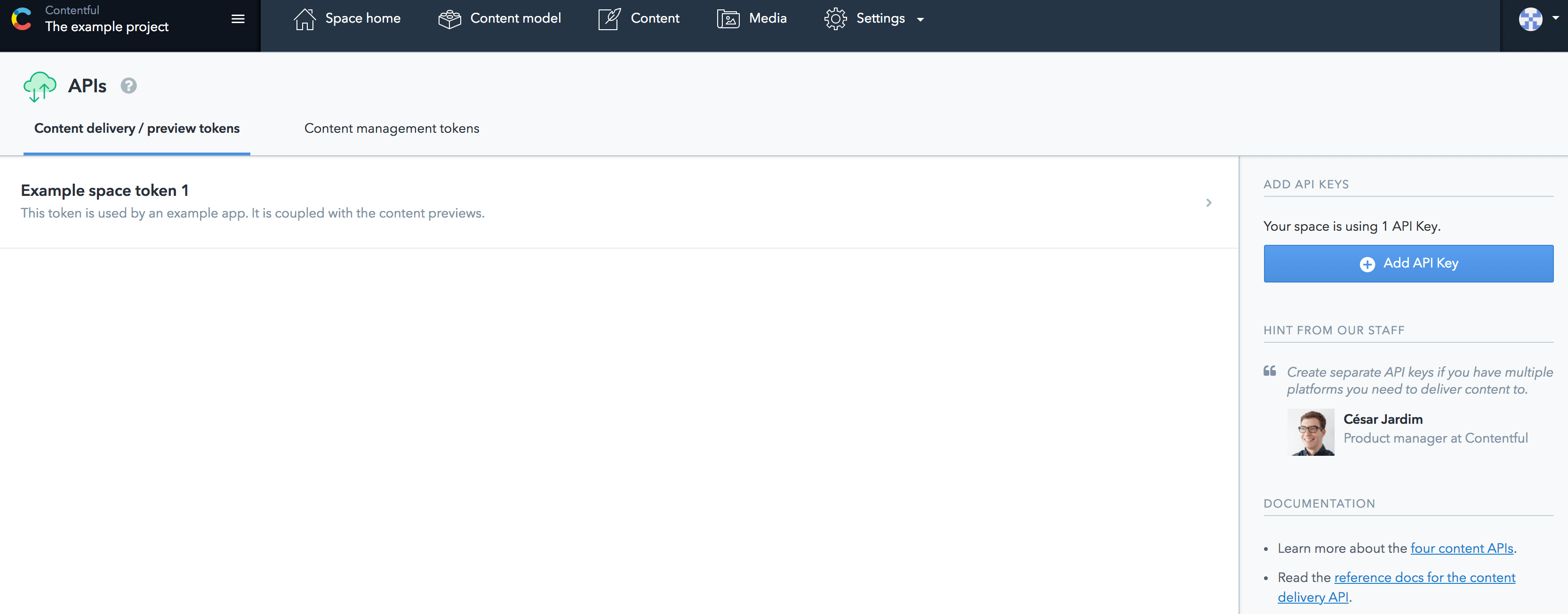 在开始导入配置之前,我们需要先配置 API 访问权限。API 访问配置是连接 Contentful 与静态网站生成器的关键,它允许我们通过API安全地获取和管理内容。在 Contentful 控制台中,进入“Settings” > “API keys”页面,在这里我们可以创建和管理 API 密钥。