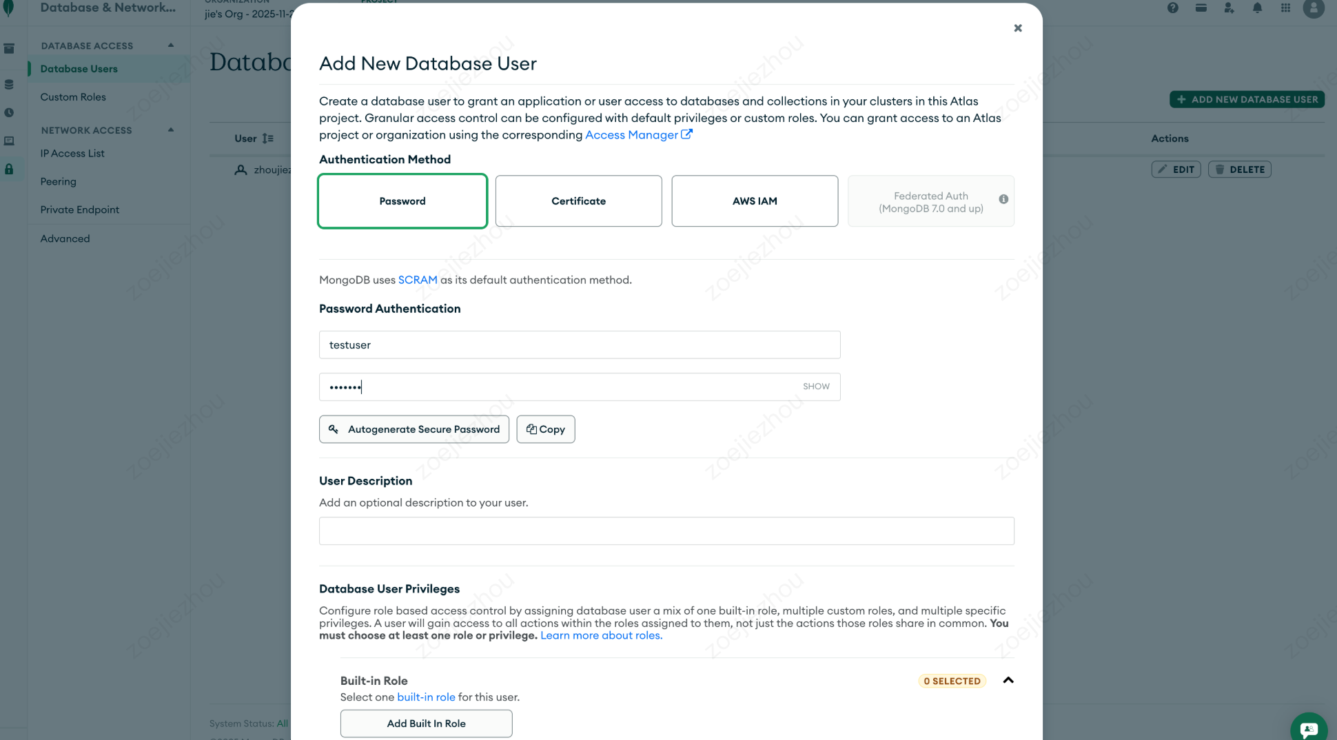 在 Database Access 页面创建一个新用户,记录下 Username 和 Password。